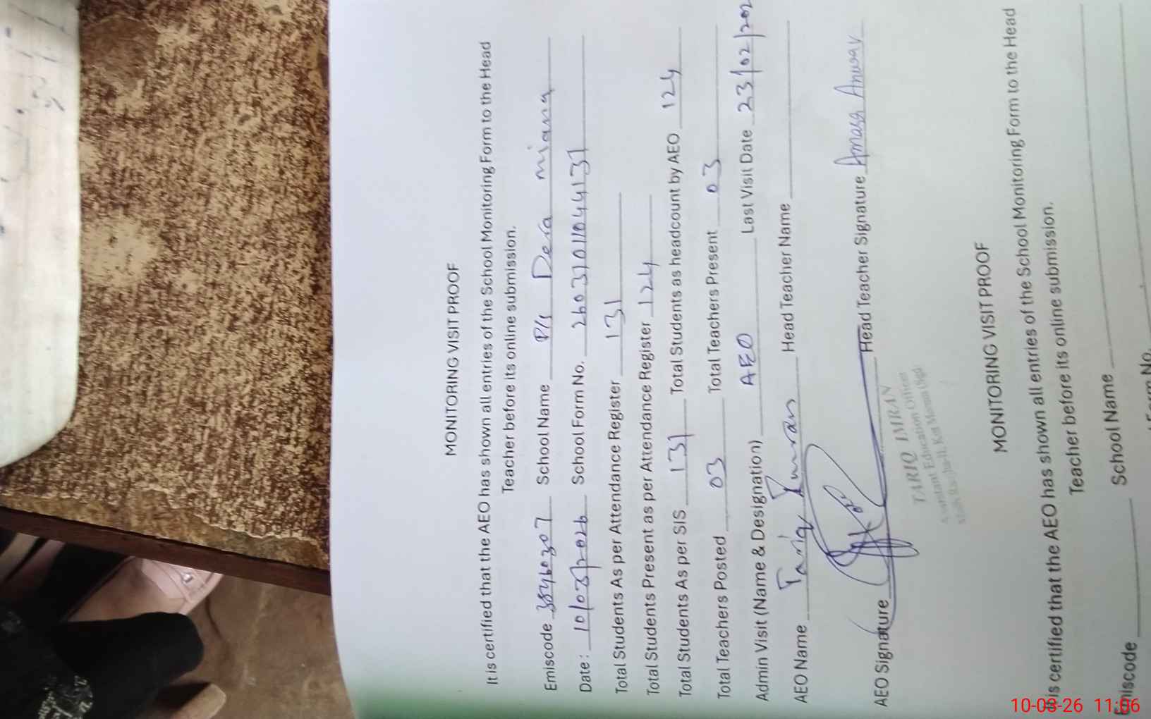 | Attendance Register | Head Teacher | MEA with School | Visit Proof |