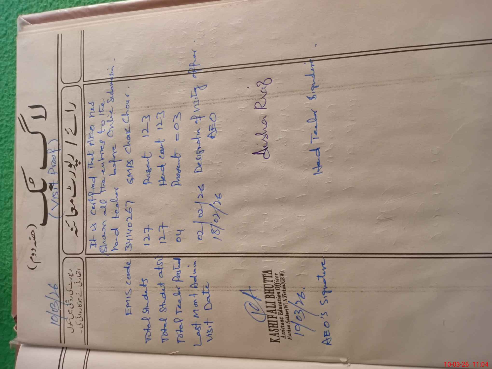 | Name: AY**** RI**** Designation: (School Headmaster's/Headmistress's) PST Phone/Cell Number: 03**** |