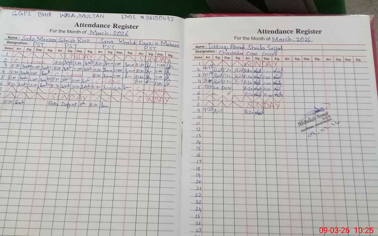| Remarks (Use Separate Page if Required): Teacher Fouzia Mubeen Pst not marked Attendence on Attendence Register up till 1045 | |||||