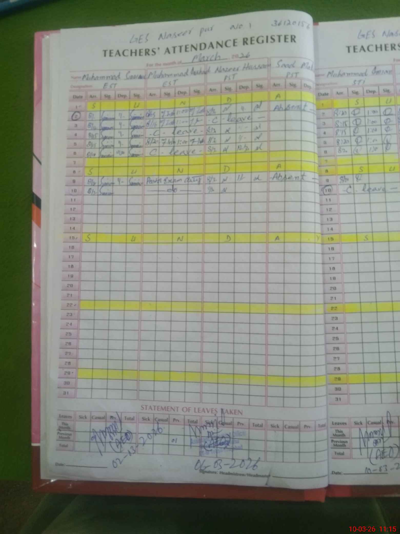| 36**** | Sa**** Ma**** | PST Science/Maths | Regular | 0 | 0 | 0 | 0 | 0 | 0 | 0 | 0 | 0 | Absent (Un-Authorized) |