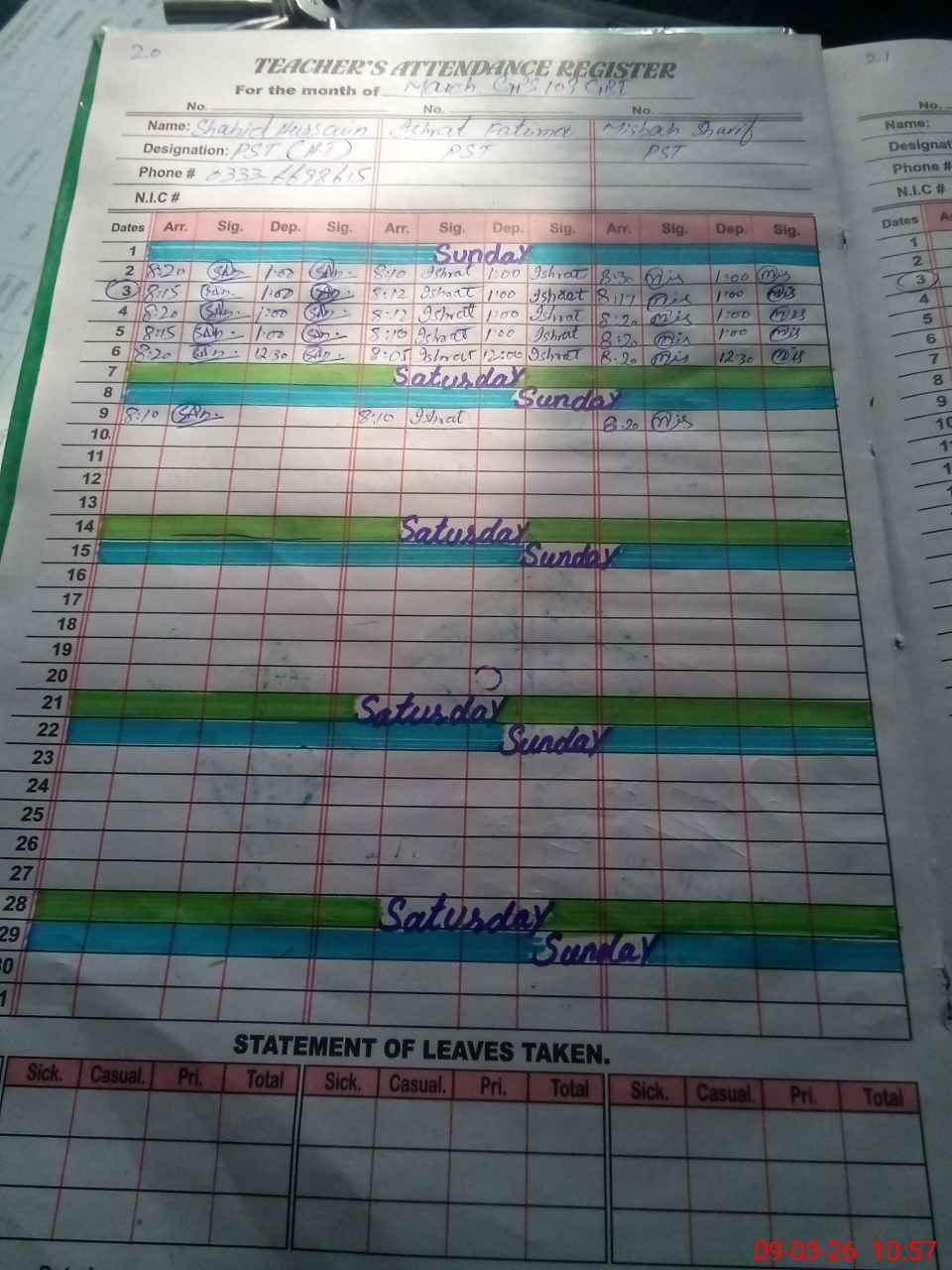 | CNIC | Full Name | Designation | R/C | Absence During Last Calender Month |