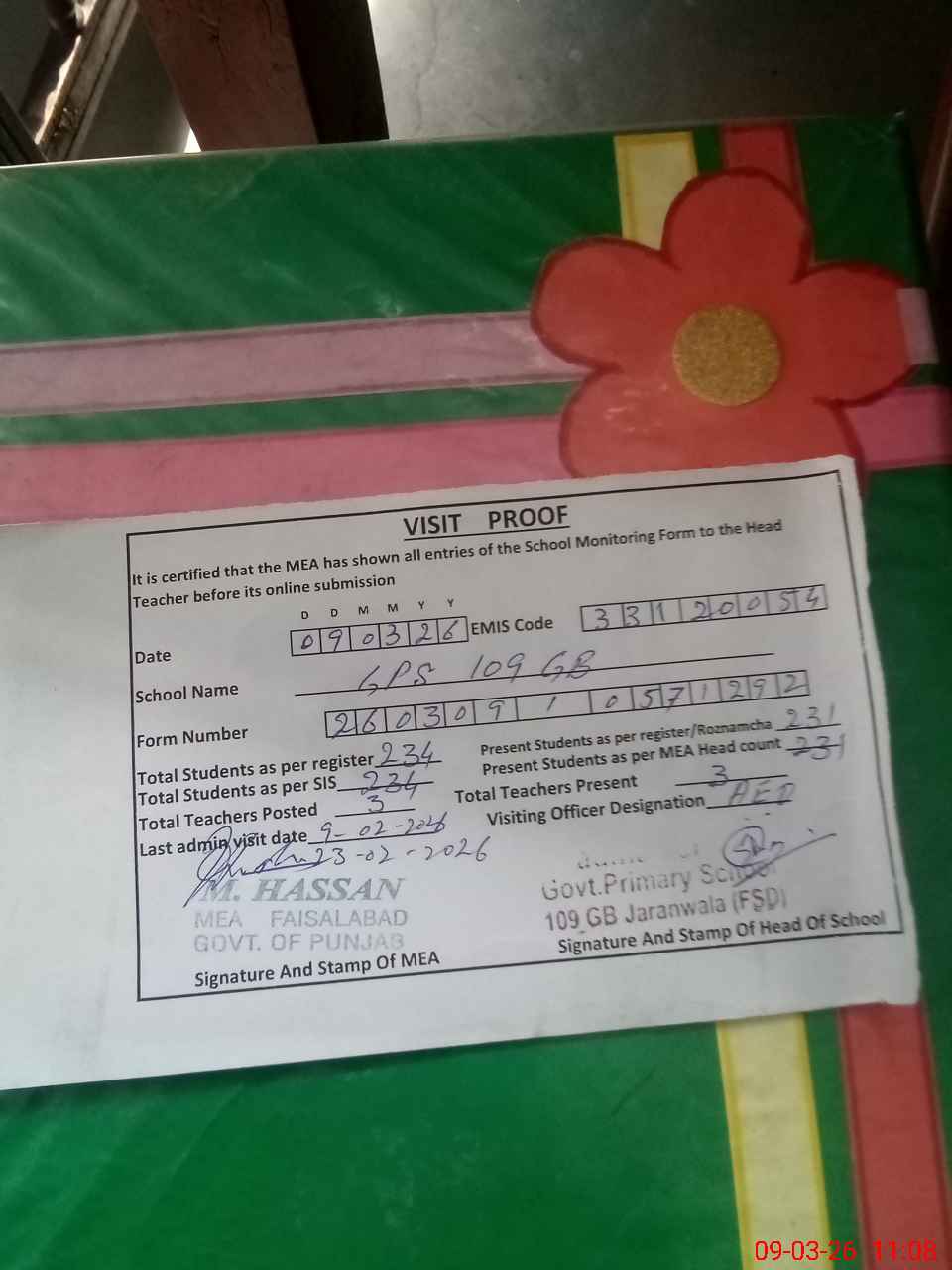| EMIS Code: 33120054 | Name of School: GPS CHAK 109 GB I JARANWALA FSD | |||