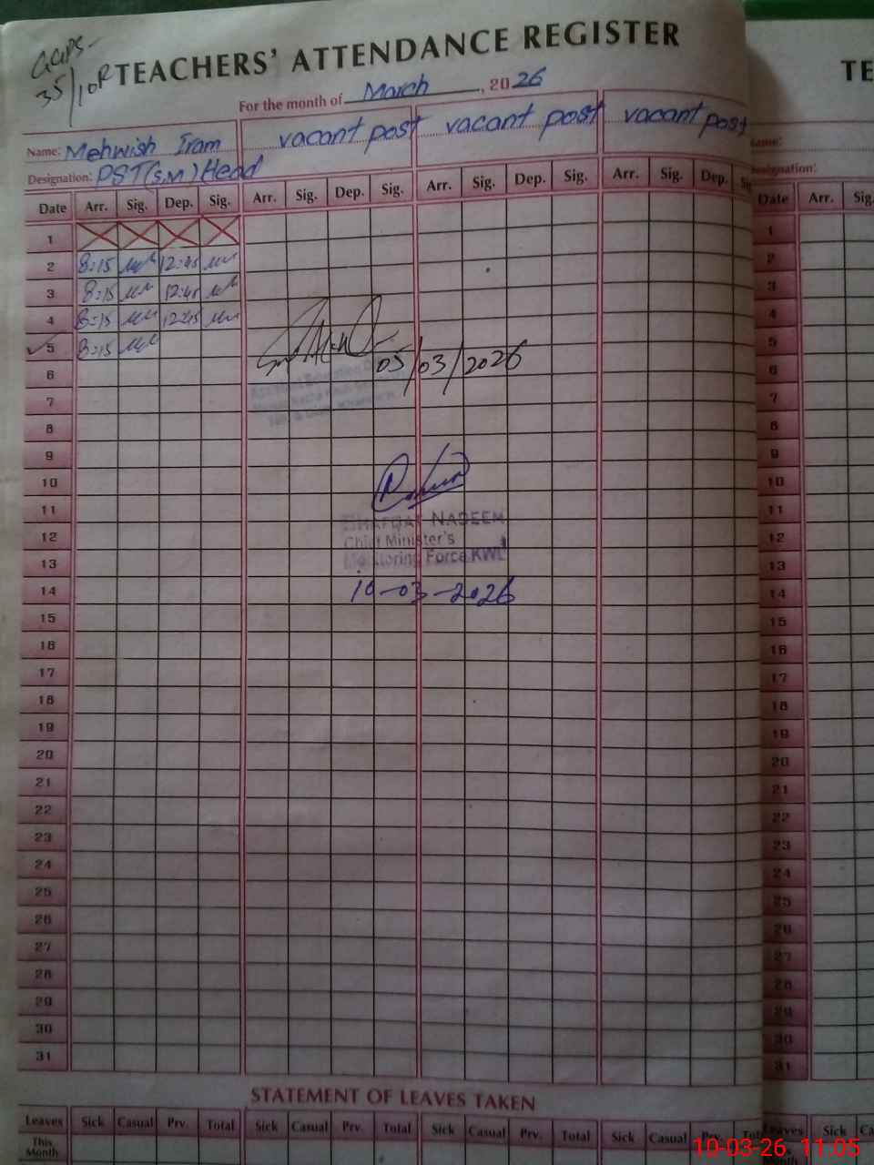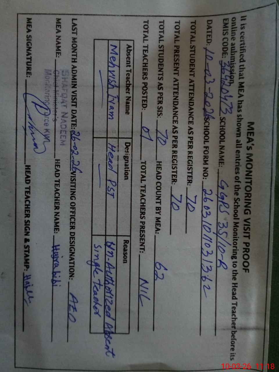 | Remarks (Use Separate Page if Required): single teacher and school head pst Mehwish Iram absent with out any disposal where as final exam in progress | |||||