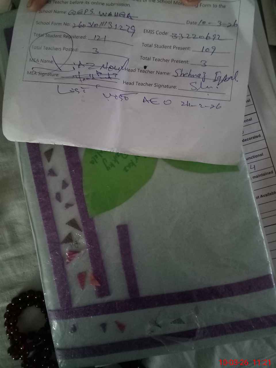 | Attendance Register | Head Teacher | MEA with School | Visit Proof |