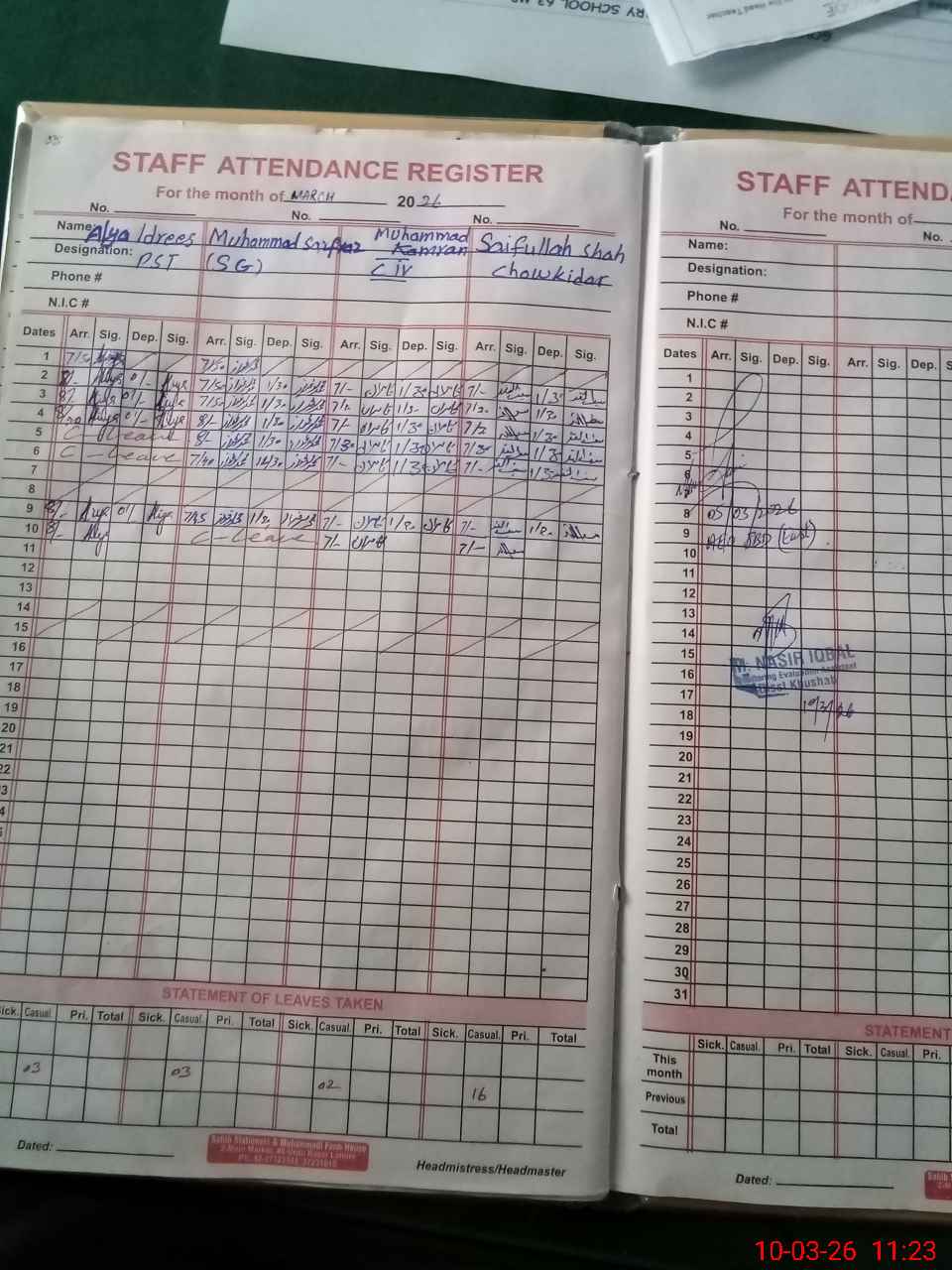 | CNIC | Full Name | Designation | R/C | Absence During Last Calender Month |
