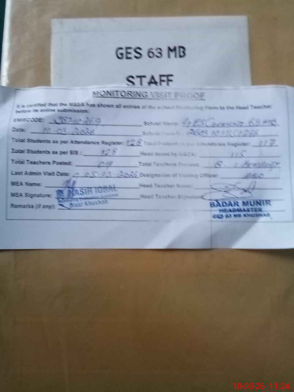 | Attendance Register | Head Teacher | MEA with School | Visit Proof |