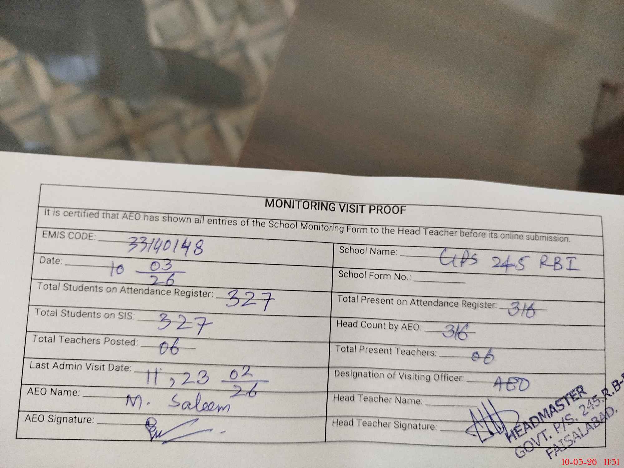 | Attendance Register | Head Teacher | MEA with School | Visit Proof |
