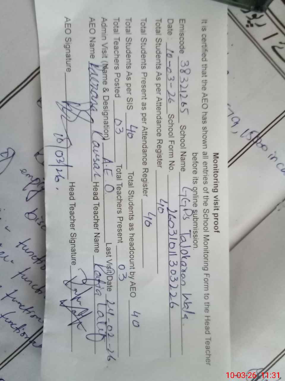 | Monitoring Date: 10-03-2026 | Start Time: 10-03-2026 11:14 AM | End Time: 10-03-2026 11:32 AM | Name of MEA: Fa**** Ko**** | |