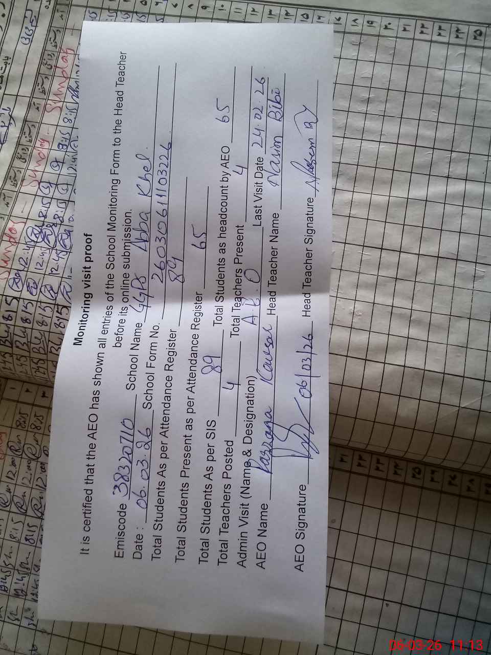 | Attendance Register | Head Teacher | MEA with School | Visit Proof |