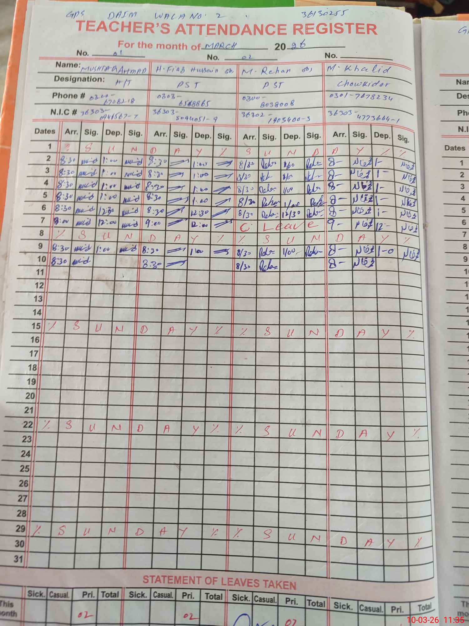 | CNIC | Full Name | Designation | R/C | Absence During Last Calender Month |