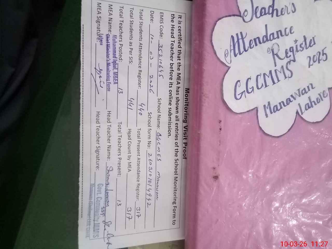 | Attendance Register | Head Teacher | MEA with School | Visit Proof |