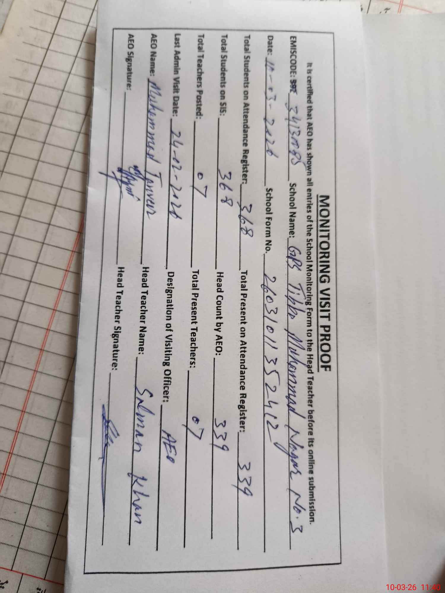 | Certified that this School was Inspected by the Undersigned MEA/DMO Today and the Information Stated Above is as Per Record. | |||||