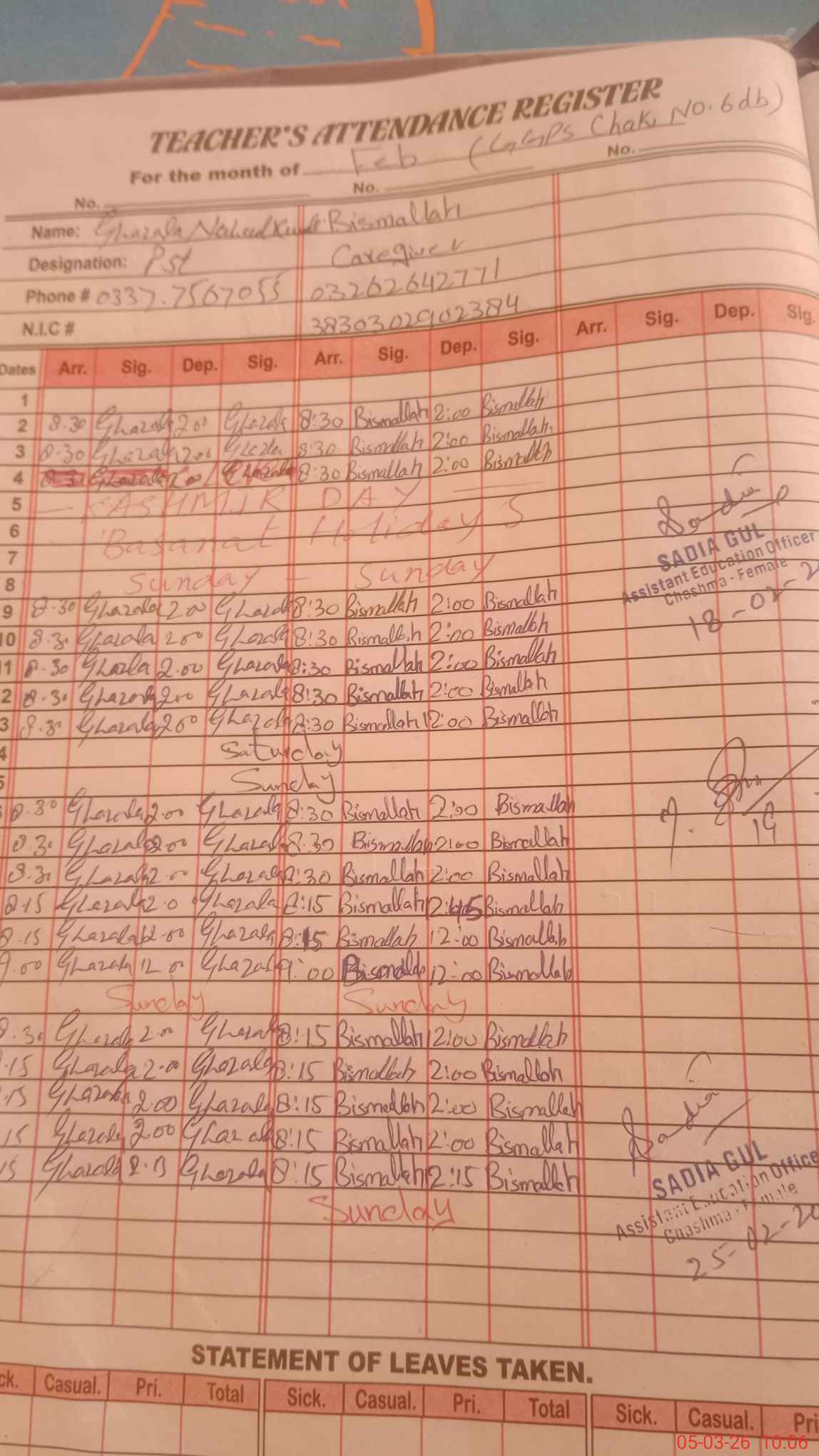 | Name: SA**** SH**** Designation: (School Headmaster's/Headmistress's) PST Phone/Cell Number: 03**** |