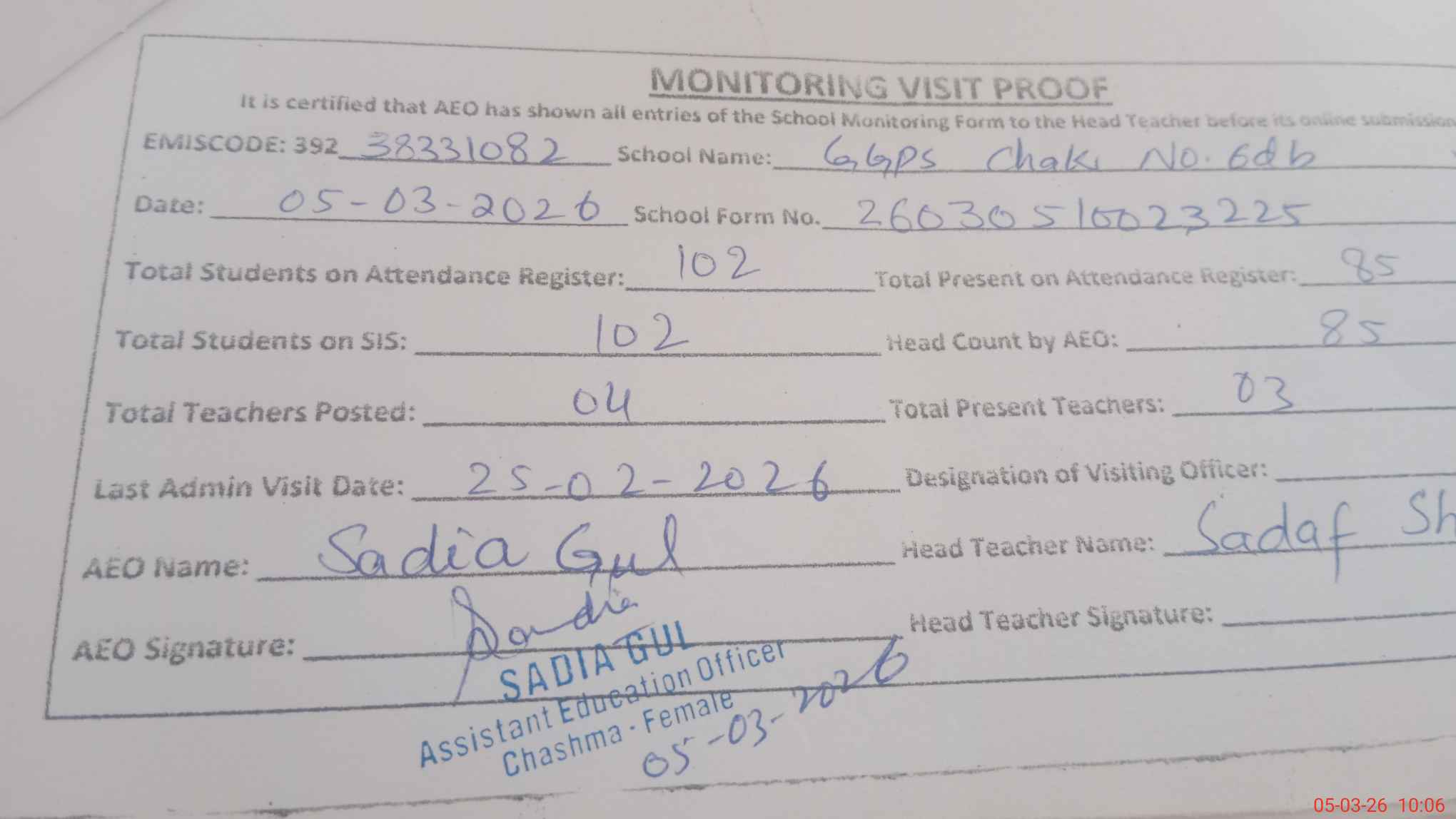 | EMIS Code: 38331082 | Name of School: GGPS CHAK NO.6 DB | |||