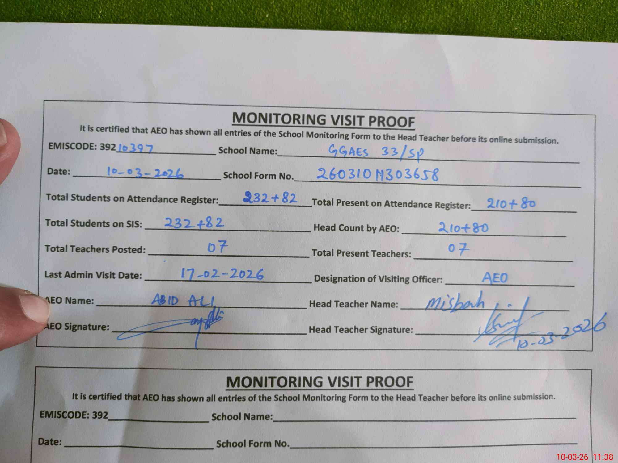 | Monitoring Date: 10-03-2026 | Start Time: 10-03-2026 11:16 AM | End Time: 10-03-2026 11:40 AM | Name of MEA: Ab**** Al**** | |
