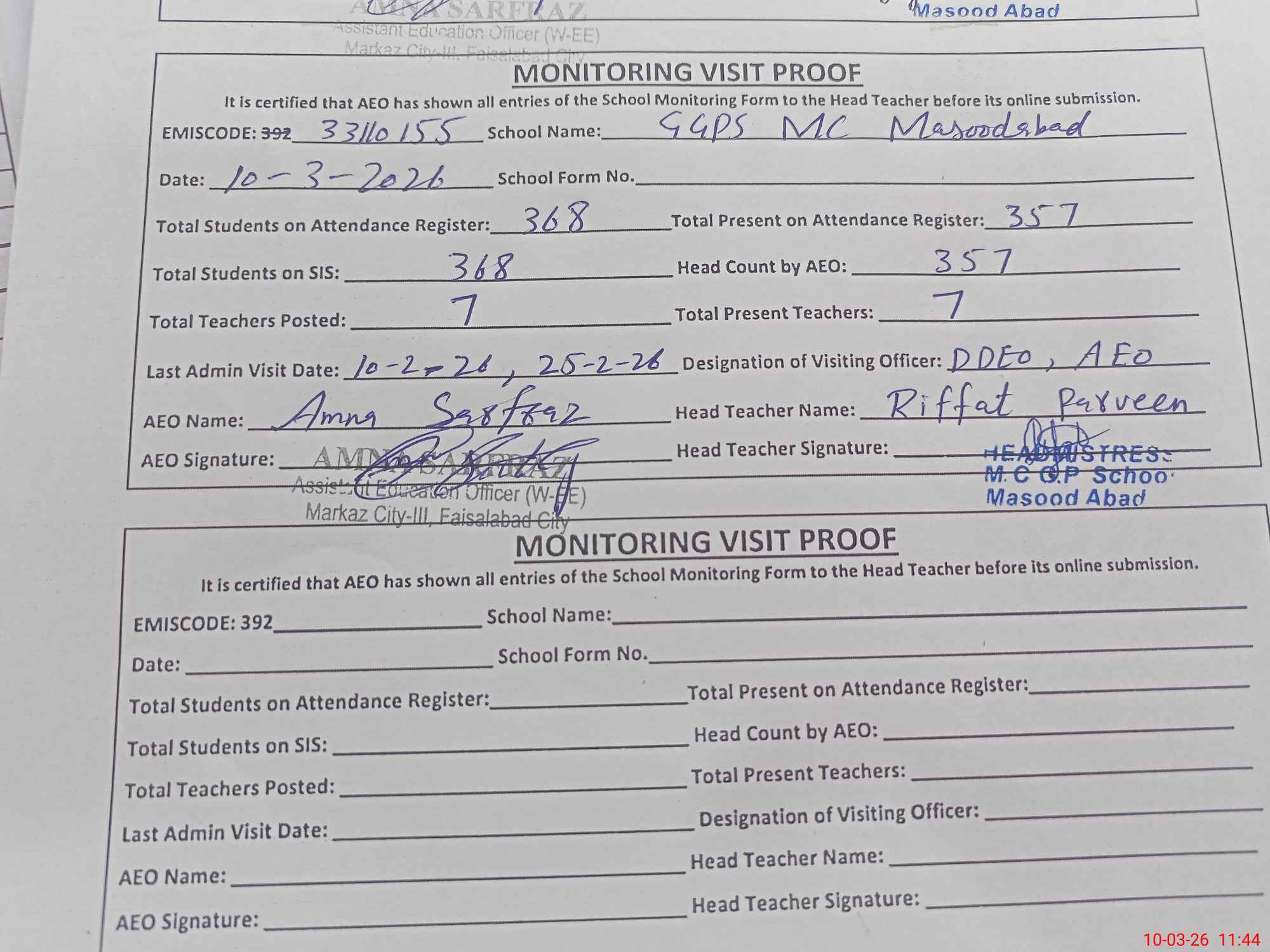 | Monitoring Date: 10-03-2026 | Start Time: 10-03-2026 11:33 AM | End Time: 10-03-2026 11:44 AM | Name of MEA: AM**** SA**** | |
