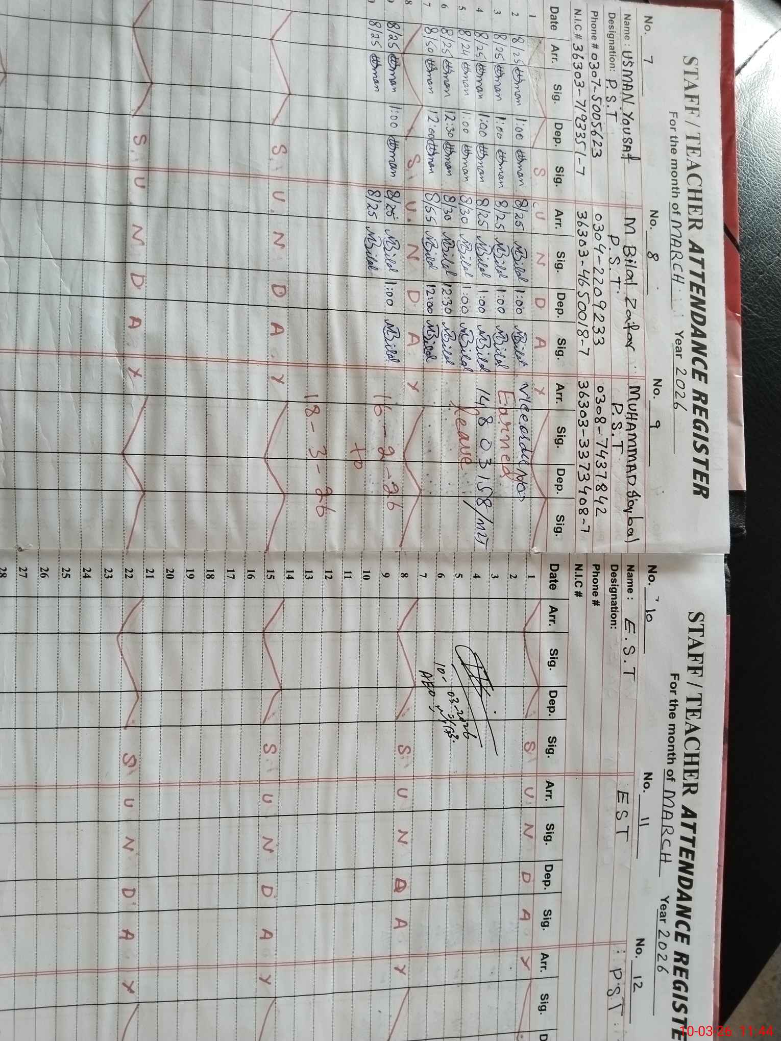 | CNIC | Full Name | Designation | R/C | Absence During Last Calender Month |