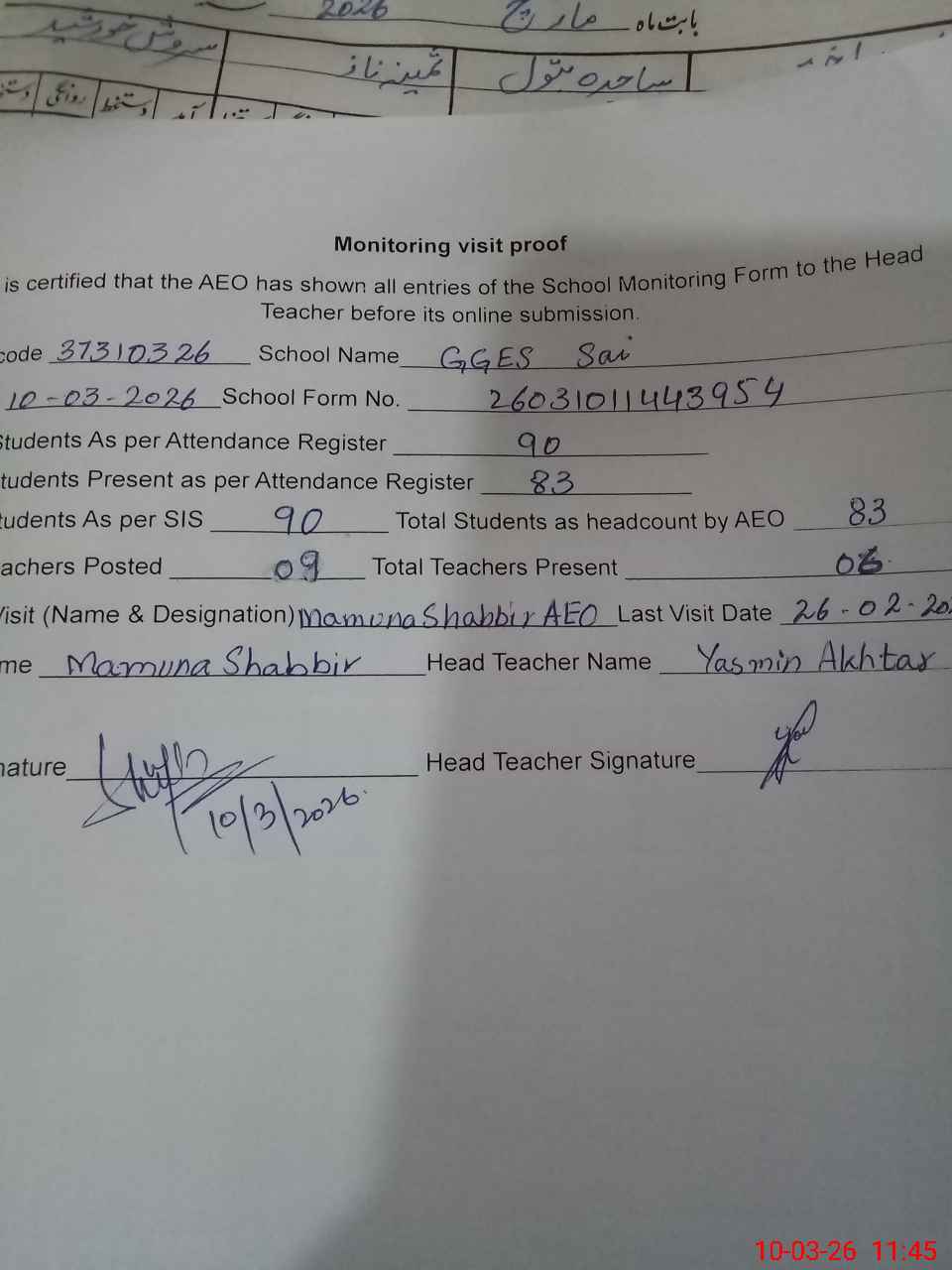 | Remarks (Use Separate Page if Required): SBA is being conducted in school premises as per routine. three teachers are found absent | |||||