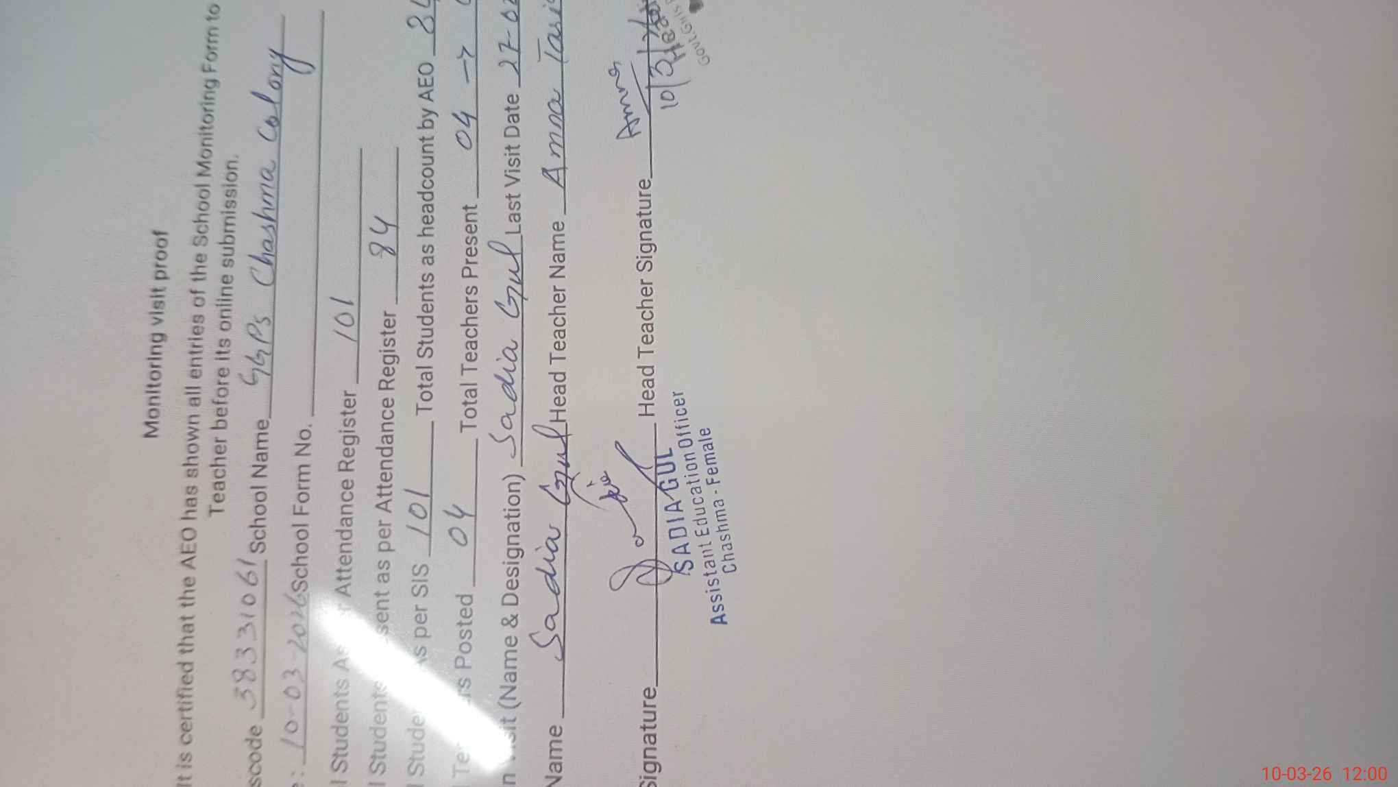 | Remarks (Use Separate Page if Required): school monitoring is done | |||||