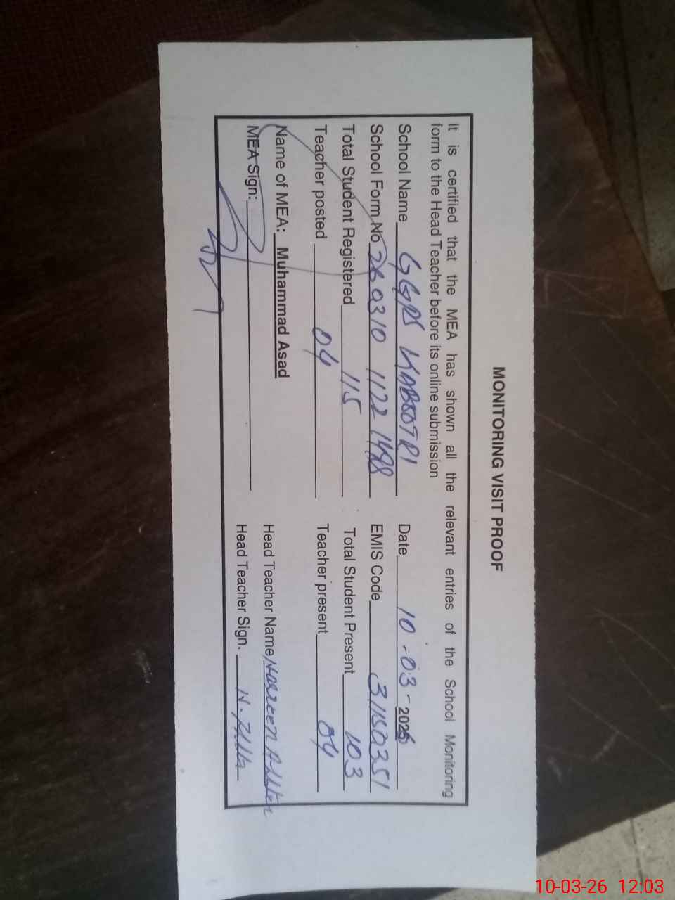 | Attendance Register | Head Teacher | MEA with School | Visit Proof |