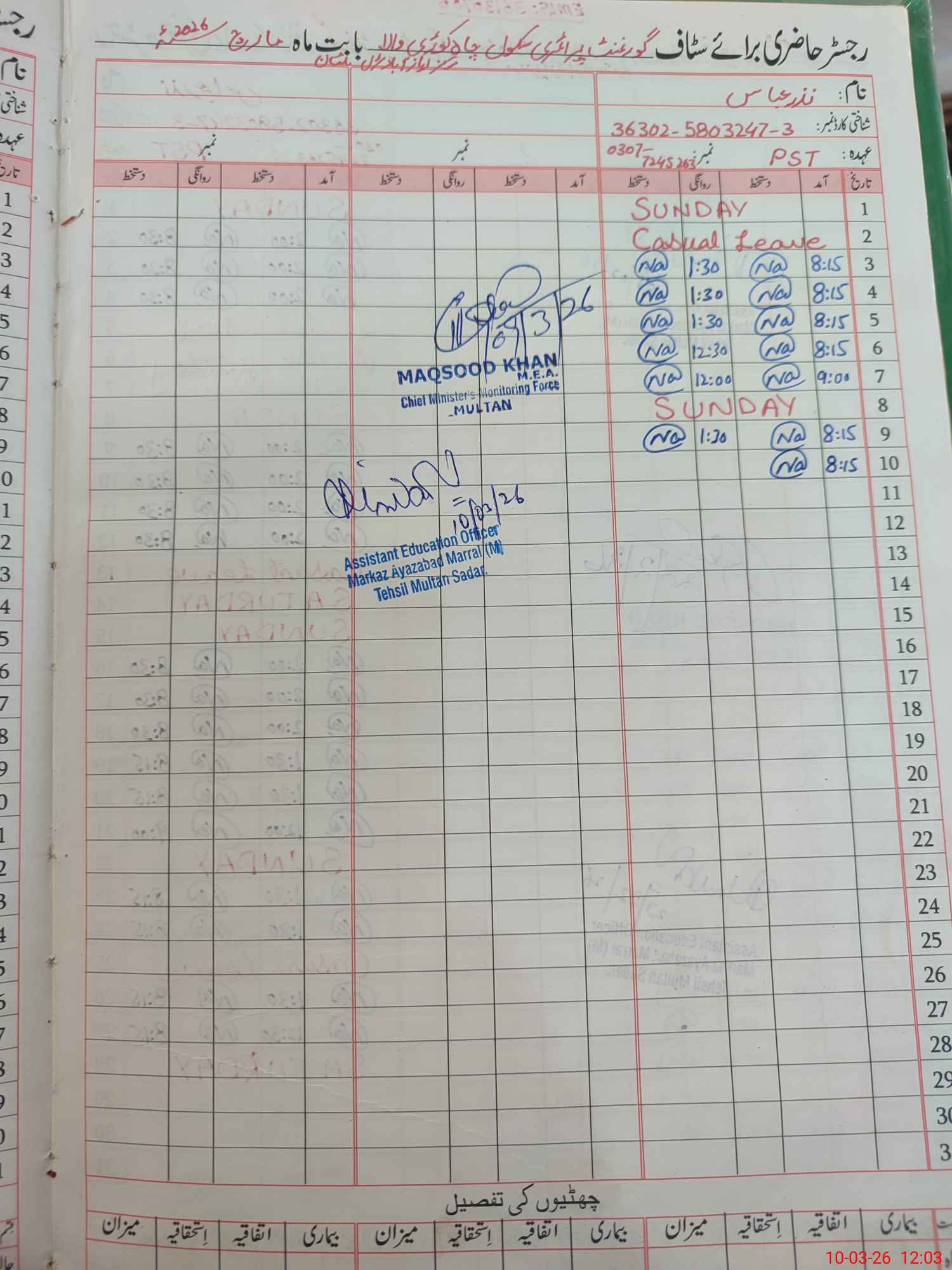 | Name: NA**** AB**** Designation: (School Headmaster's/Headmistress's) PST Phone/Cell Number: 03**** |