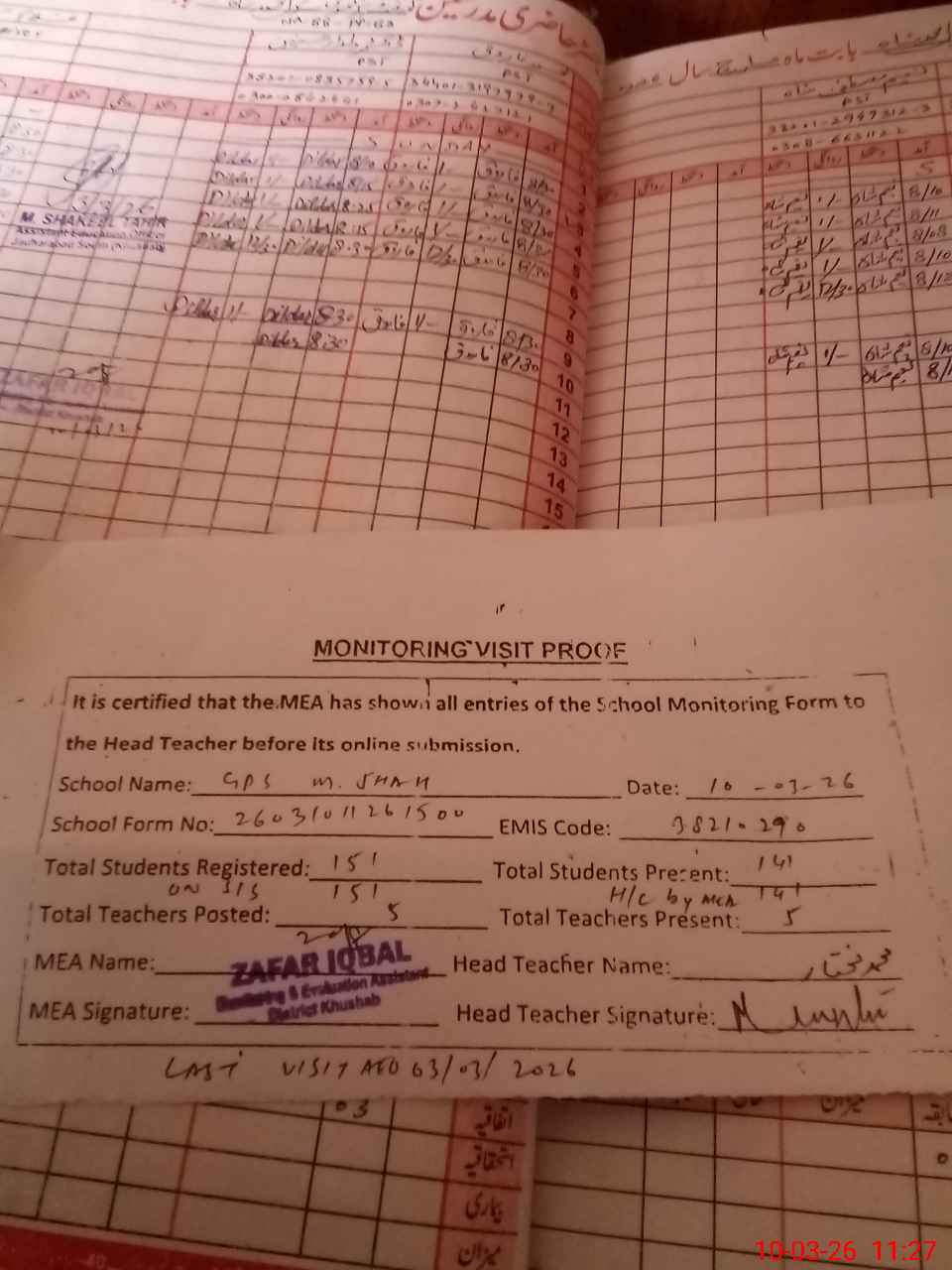 | Attendance Register | Head Teacher | MEA with School | Visit Proof |