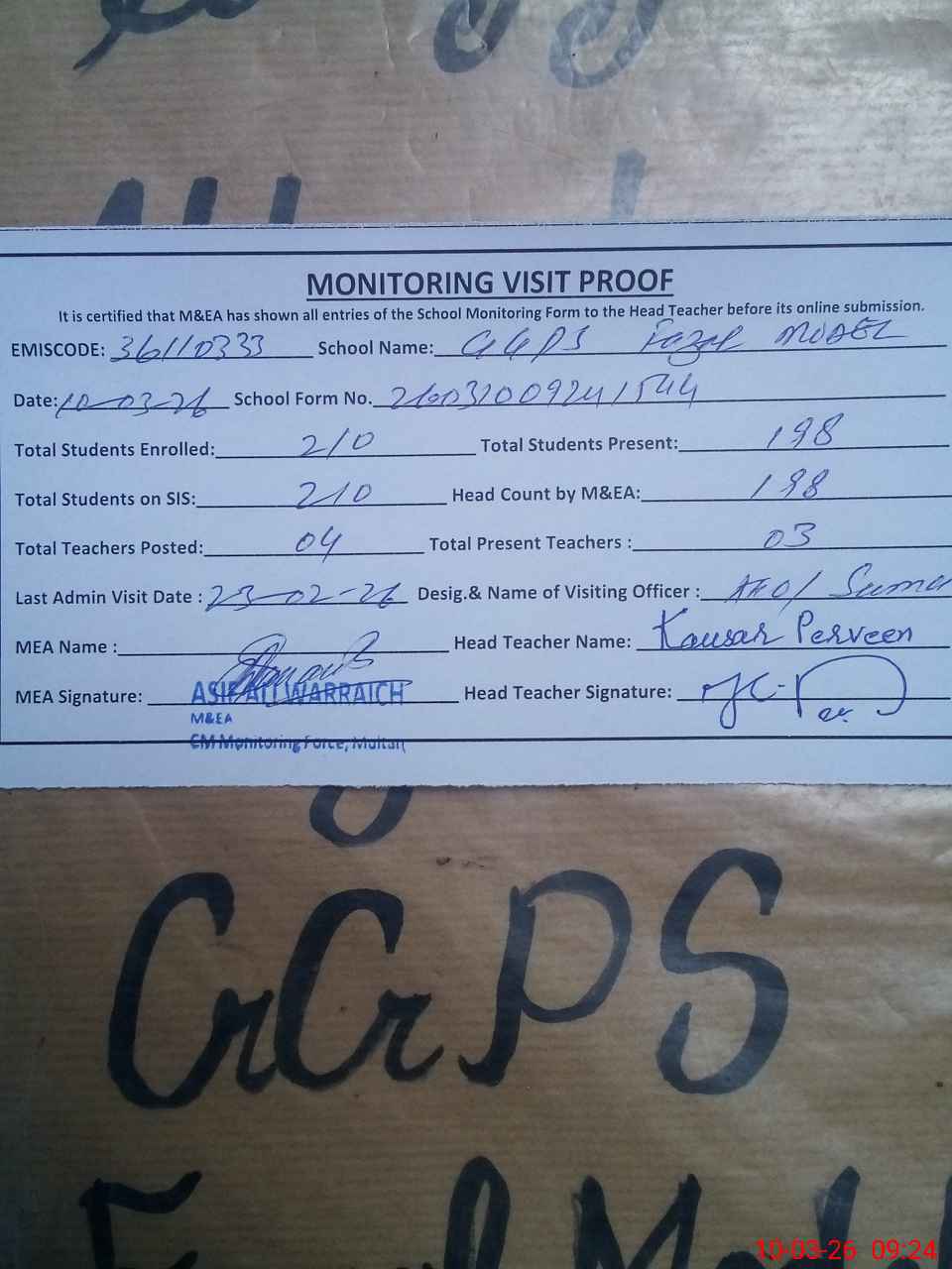 | EMIS Code: 36110333 | Name of School: GGPS FAZAL MODEL BAHAWAL PUR ROAD MULTAN | |||