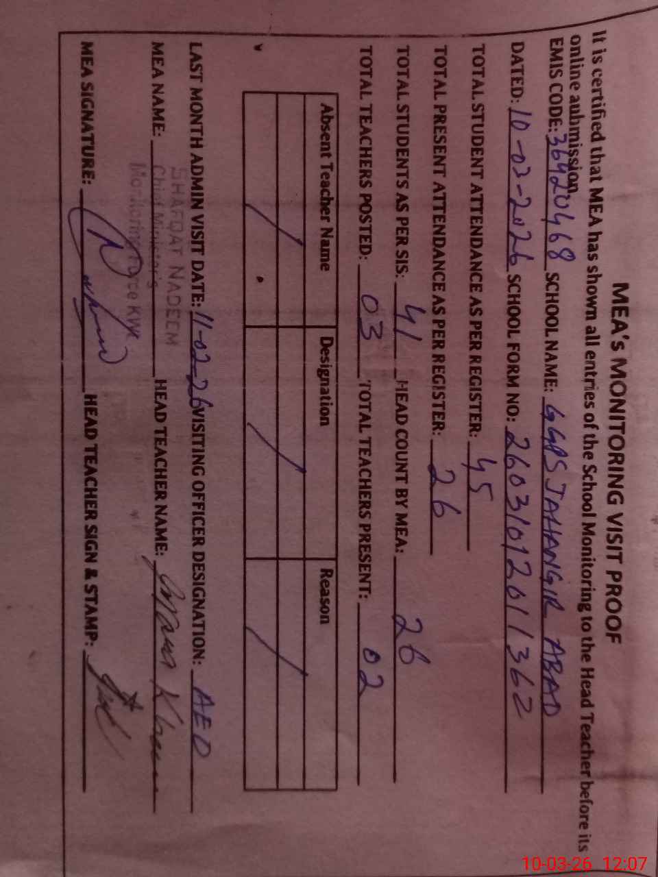 | Certified that this School was Inspected by the Undersigned MEA/DMO Today and the Information Stated Above is as Per Record. | |||||