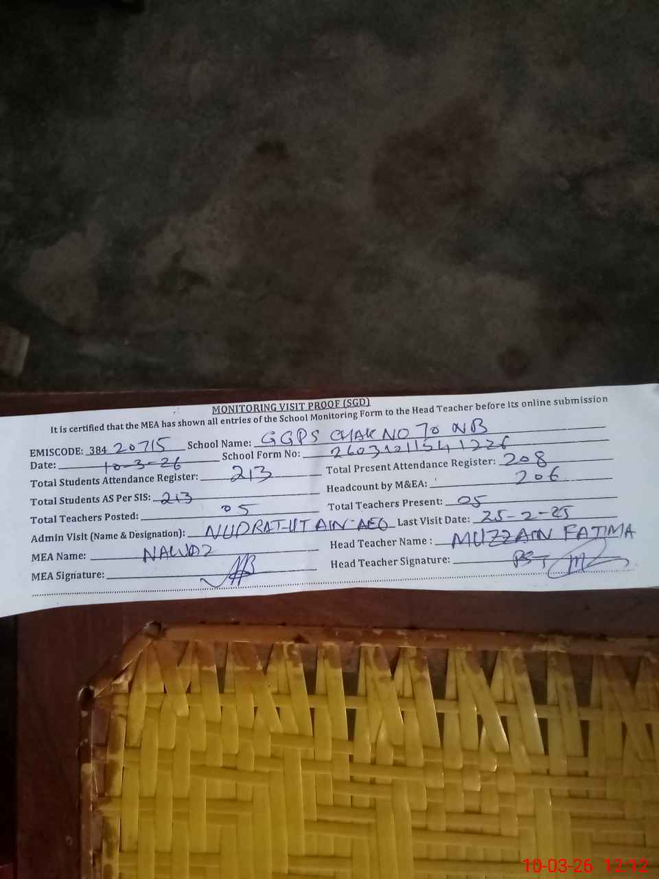 | Attendance Register | Head Teacher | MEA with School | Visit Proof |