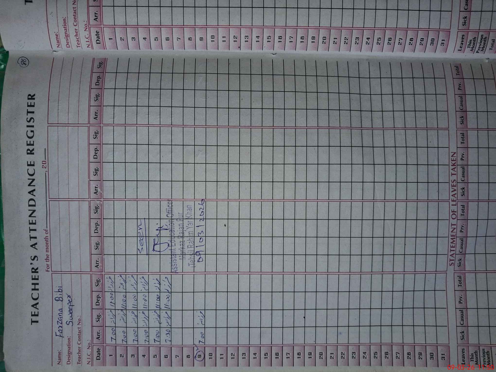 | CNIC | Full Name | Designation | R/C | Absence During Last Calender Month |
