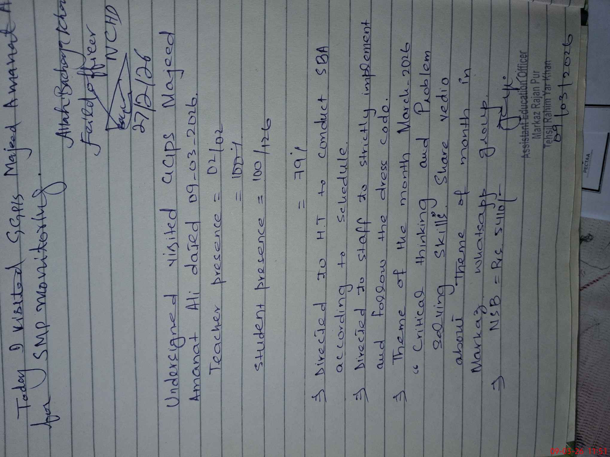 | Attendance Register | Head Teacher | MEA with School | Visit Proof |