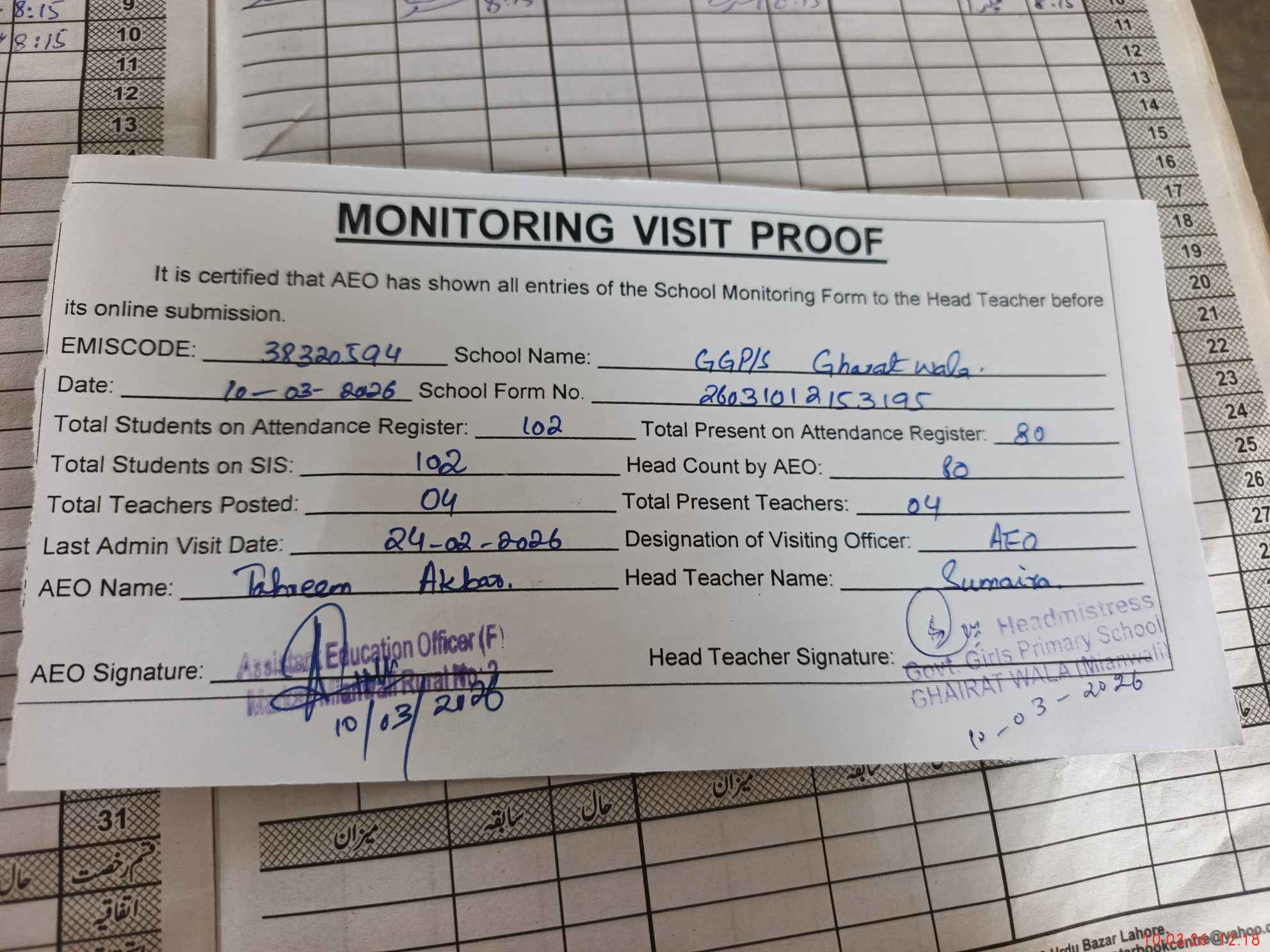 | Attendance Register | Head Teacher | MEA with School | Visit Proof |