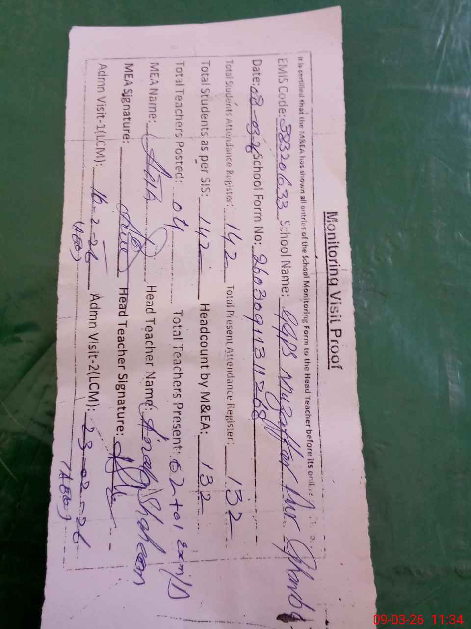 | Attendance Register | Head Teacher | MEA with School | Visit Proof |