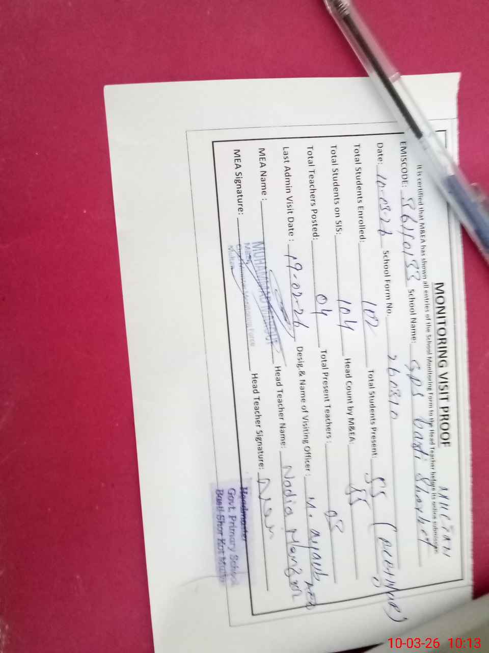 | Monitoring Date: 10-03-2026 | Start Time: 10-03-2026 09:26 AM | End Time: 10-03-2026 10:14 AM | Name of MEA: Mu**** Ma**** | |