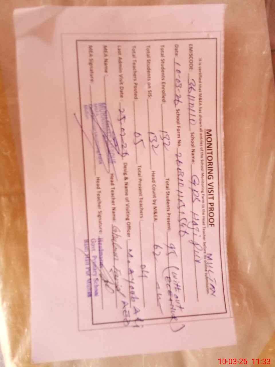 | Monitoring Date: 10-03-2026 | Start Time: 10-03-2026 11:05 AM | End Time: 10-03-2026 11:34 AM | Name of MEA: Mu**** Ma**** | |