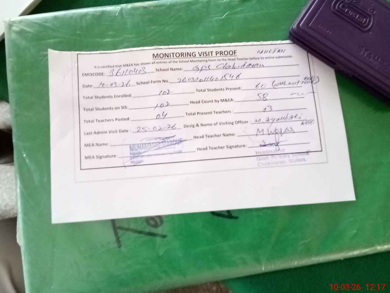 | Attendance Register | Head Teacher | MEA with School | Visit Proof |