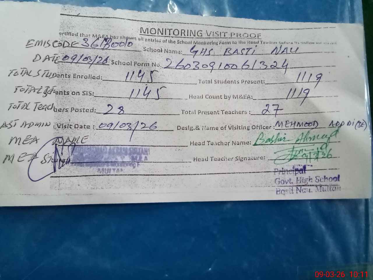 | EMIS Code: 36130010 | Name of School: GHS BASTI NAU MULTAN | |||