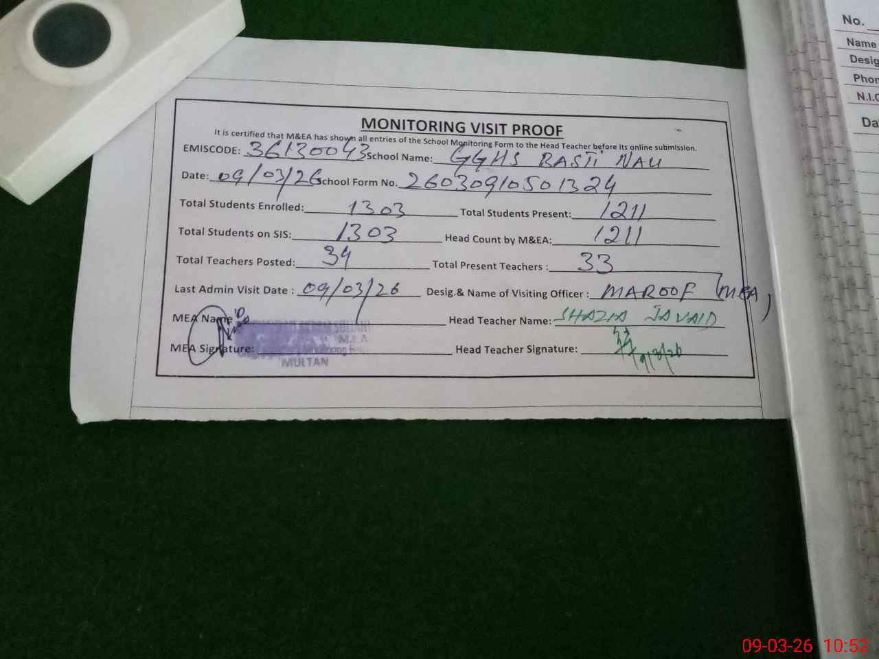 | Monitoring Date: 09-03-2026 | Start Time: 09-03-2026 10:23 AM | End Time: 09-03-2026 10:54 AM | Name of MEA: MU**** AK**** | |