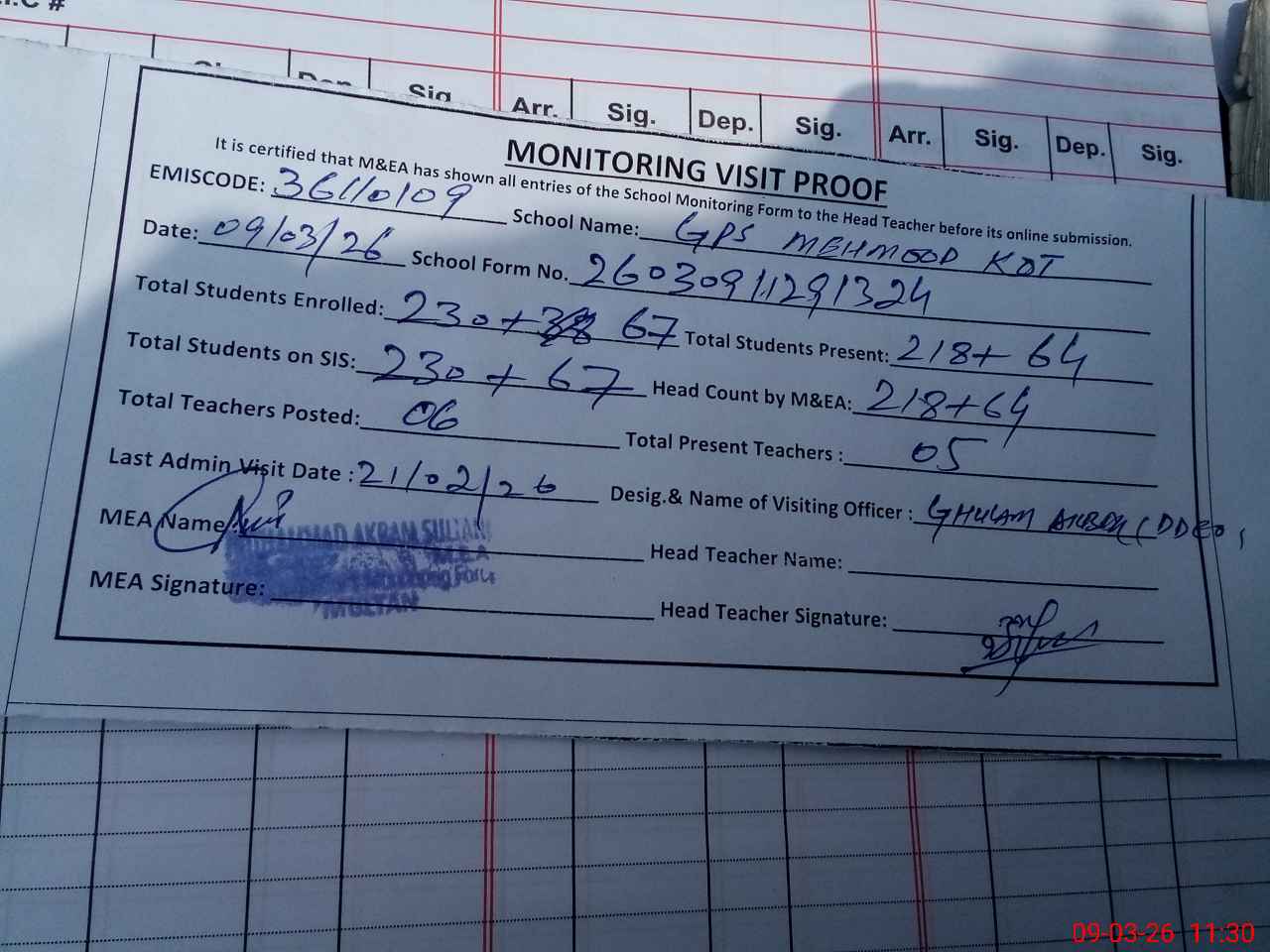 | EMIS Code: 36110109 | Name of School: GPS MEHMOOD KOT BOSAN ROAD MULTAN | |||