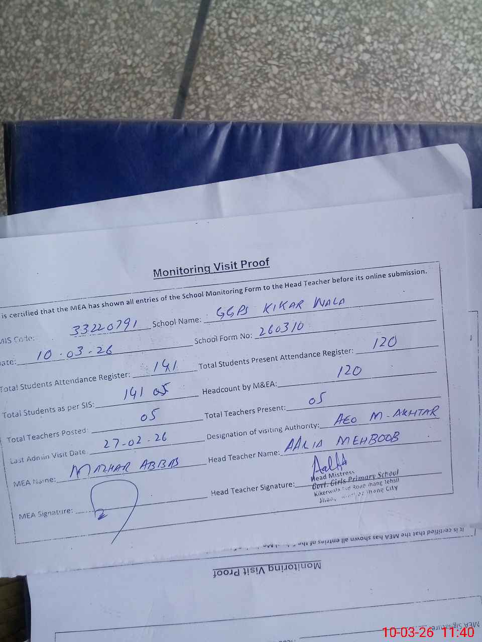 | Attendance Register | Head Teacher | MEA with School | Visit Proof |