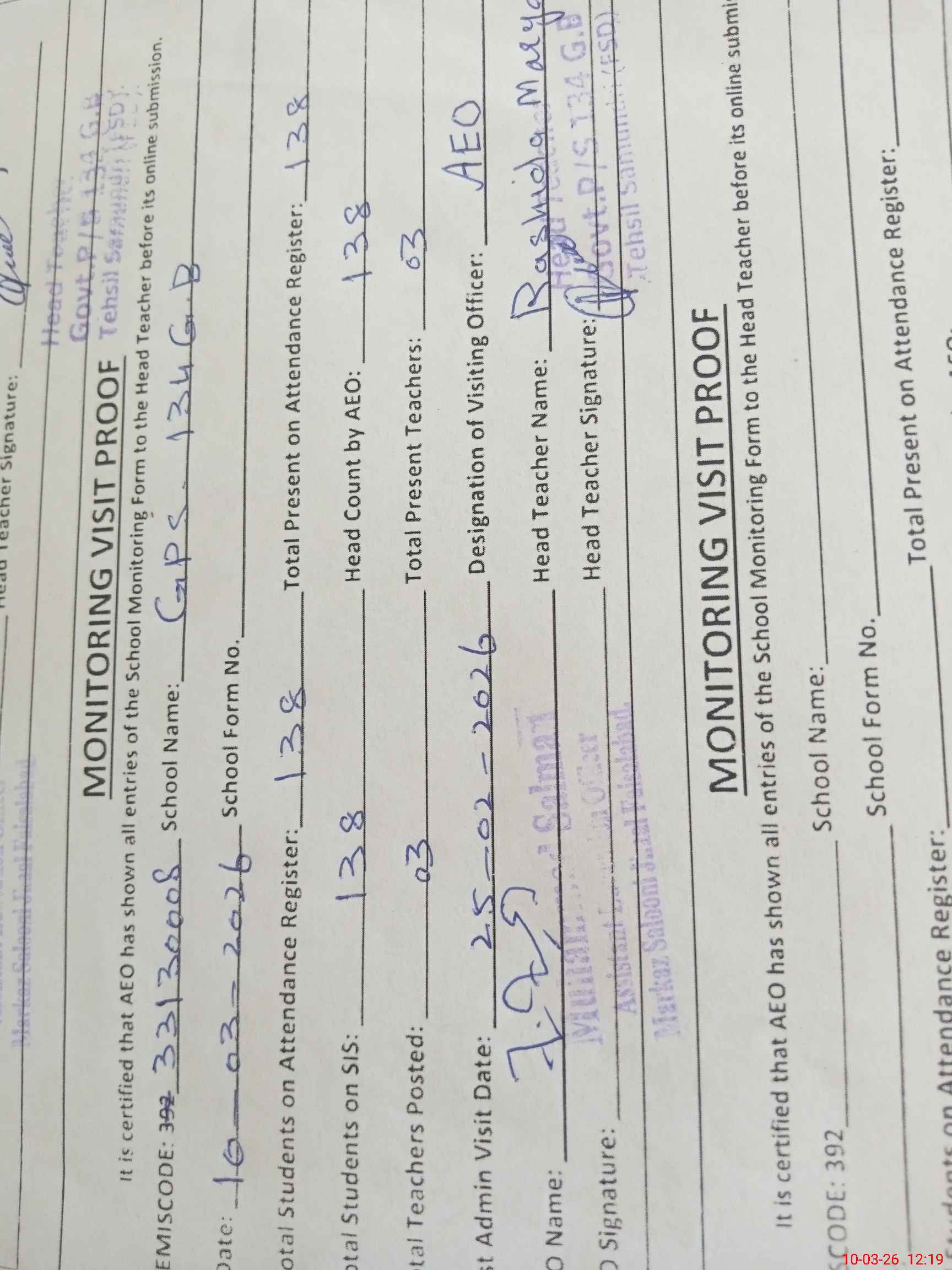 | Attendance Register | Head Teacher | MEA with School | Visit Proof |