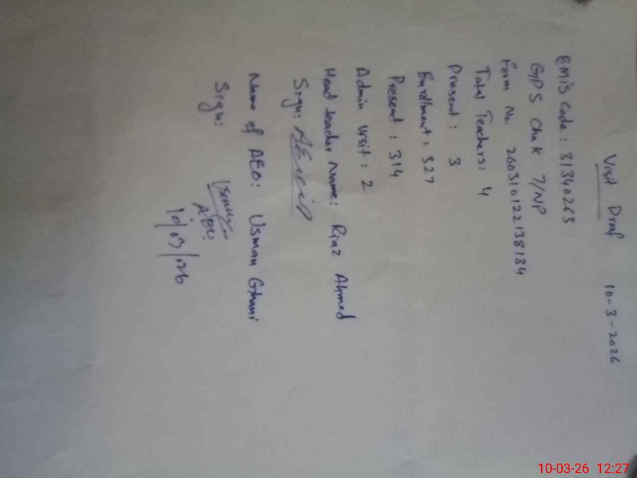 | EMIS Code: 31340263 | Name of School: GPS CHAK NO 7/NP | |||