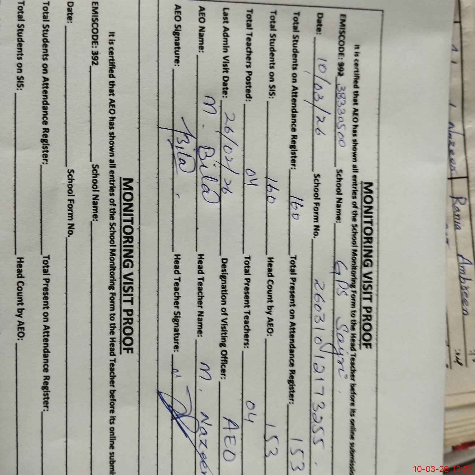 | Monitoring Date: 10-03-2026 | Start Time: 10-03-2026 11:59 AM | End Time: 10-03-2026 12:28 PM | Name of MEA: Mu**** Bi**** | |