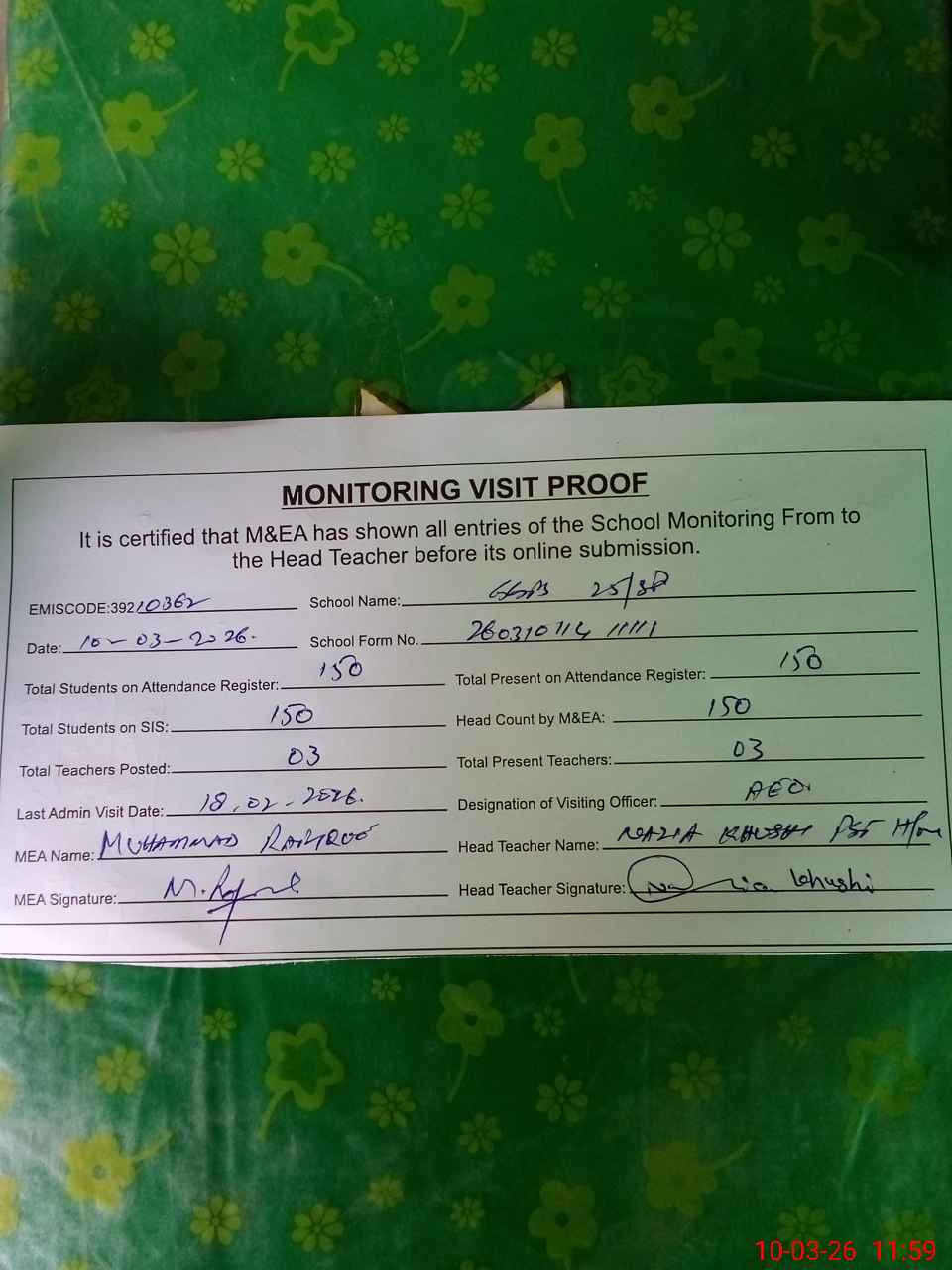 | Certified that this School was Inspected by the Undersigned MEA/DMO Today and the Information Stated Above is as Per Record. | |||||