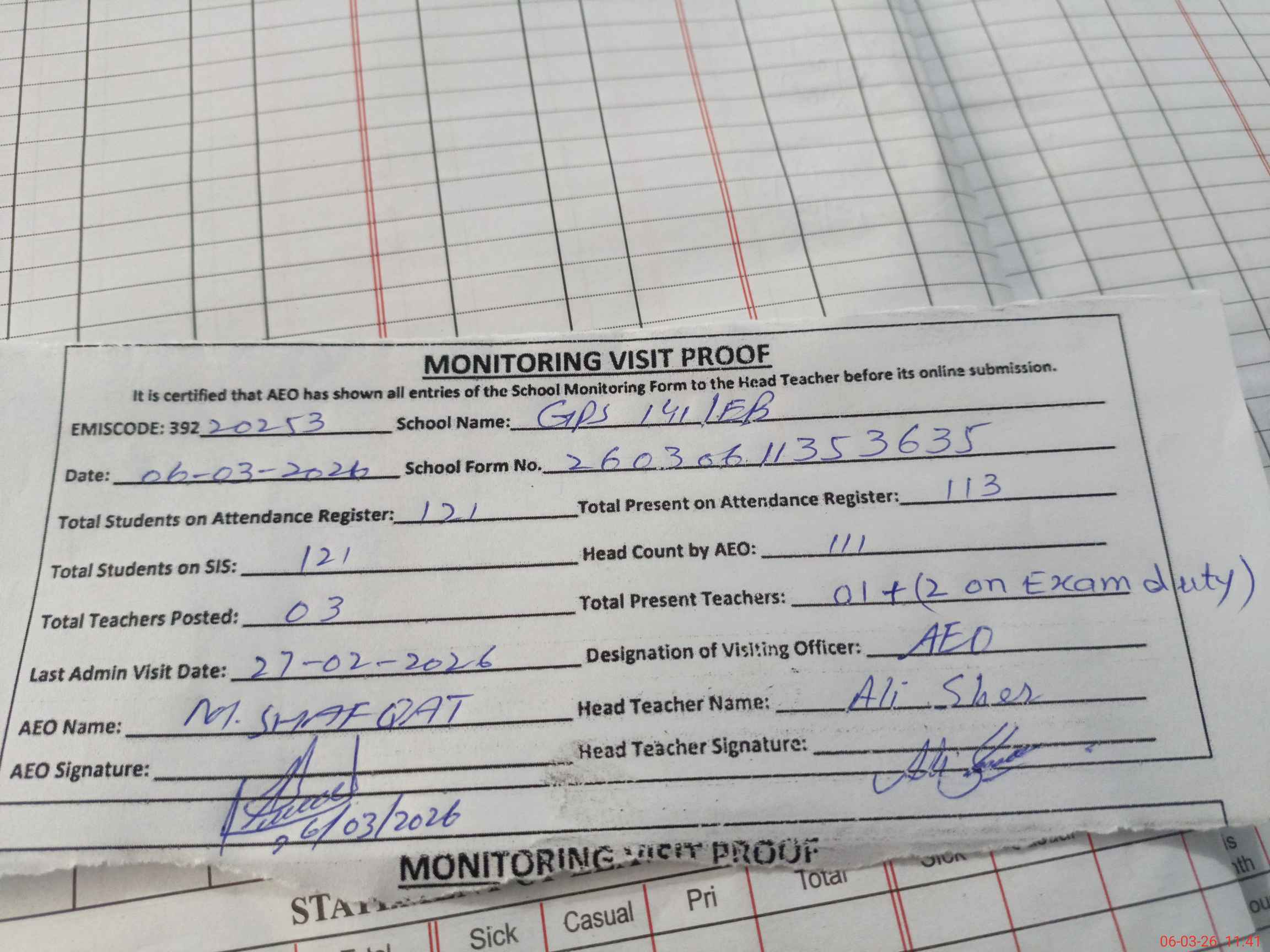 | Attendance Register | Head Teacher | MEA with School | Visit Proof |