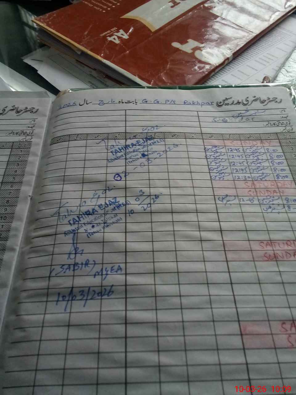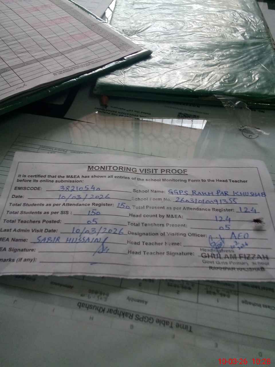 | Remarks (Use Separate Page if Required): no teacher absent total students on register 150 total students on SiS 150 last admin visit by AEO on 10 Mar 2026 | |||||