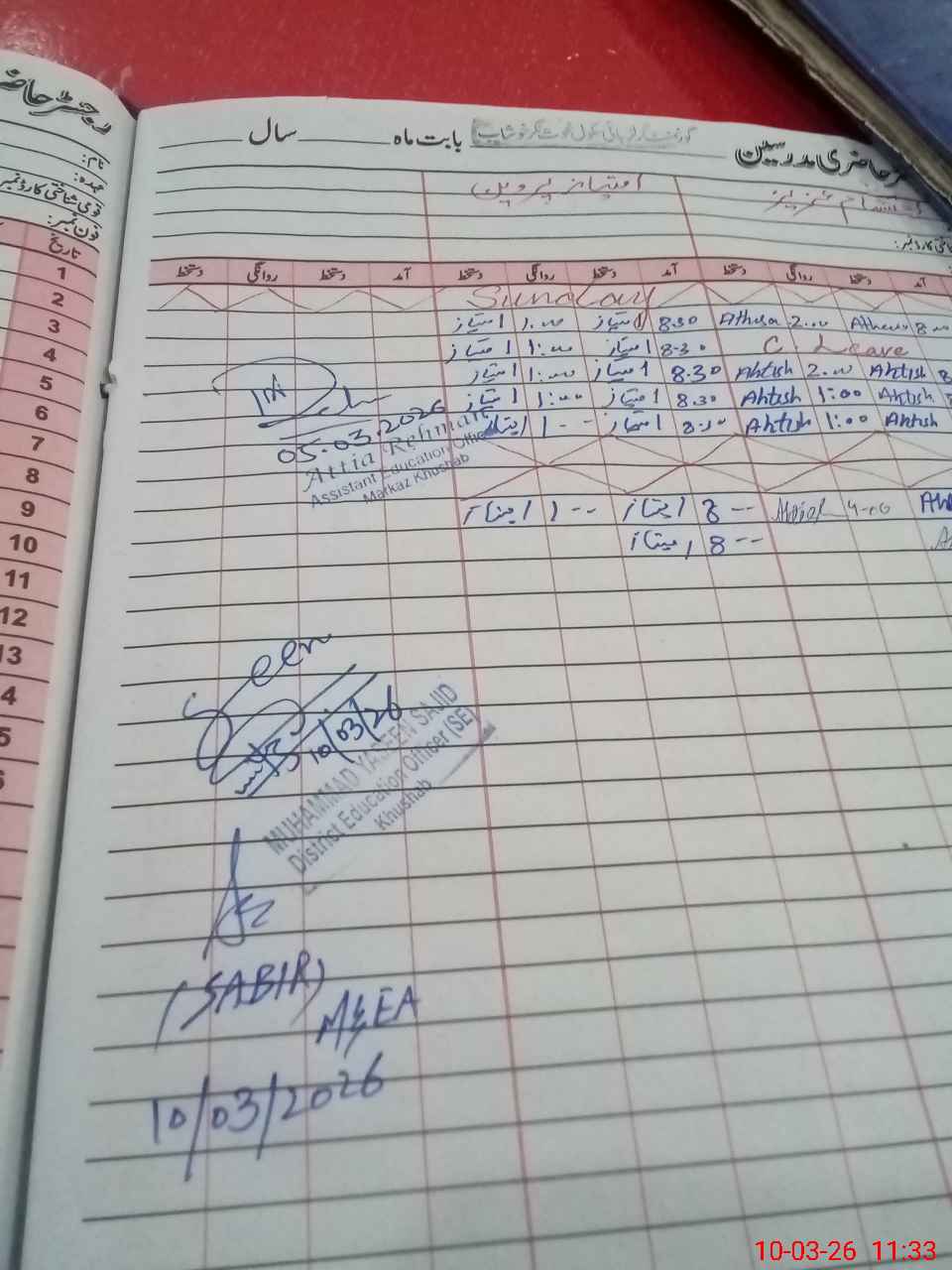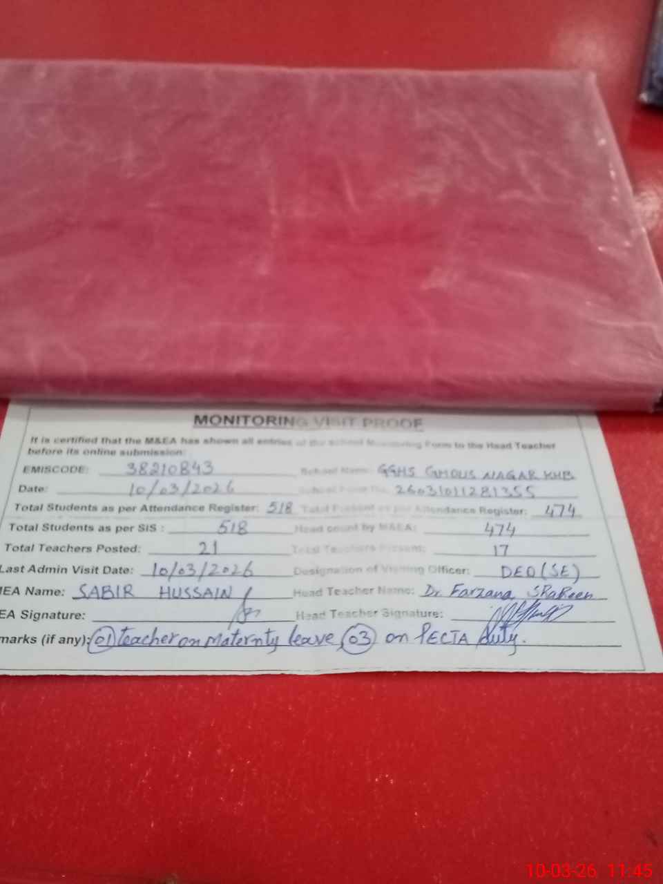 | Remarks (Use Separate Page if Required): no teacher absent total students on register 518 total students on SiS 518 last admin visit by DEO SE on 10 Mar 2026 | |||||