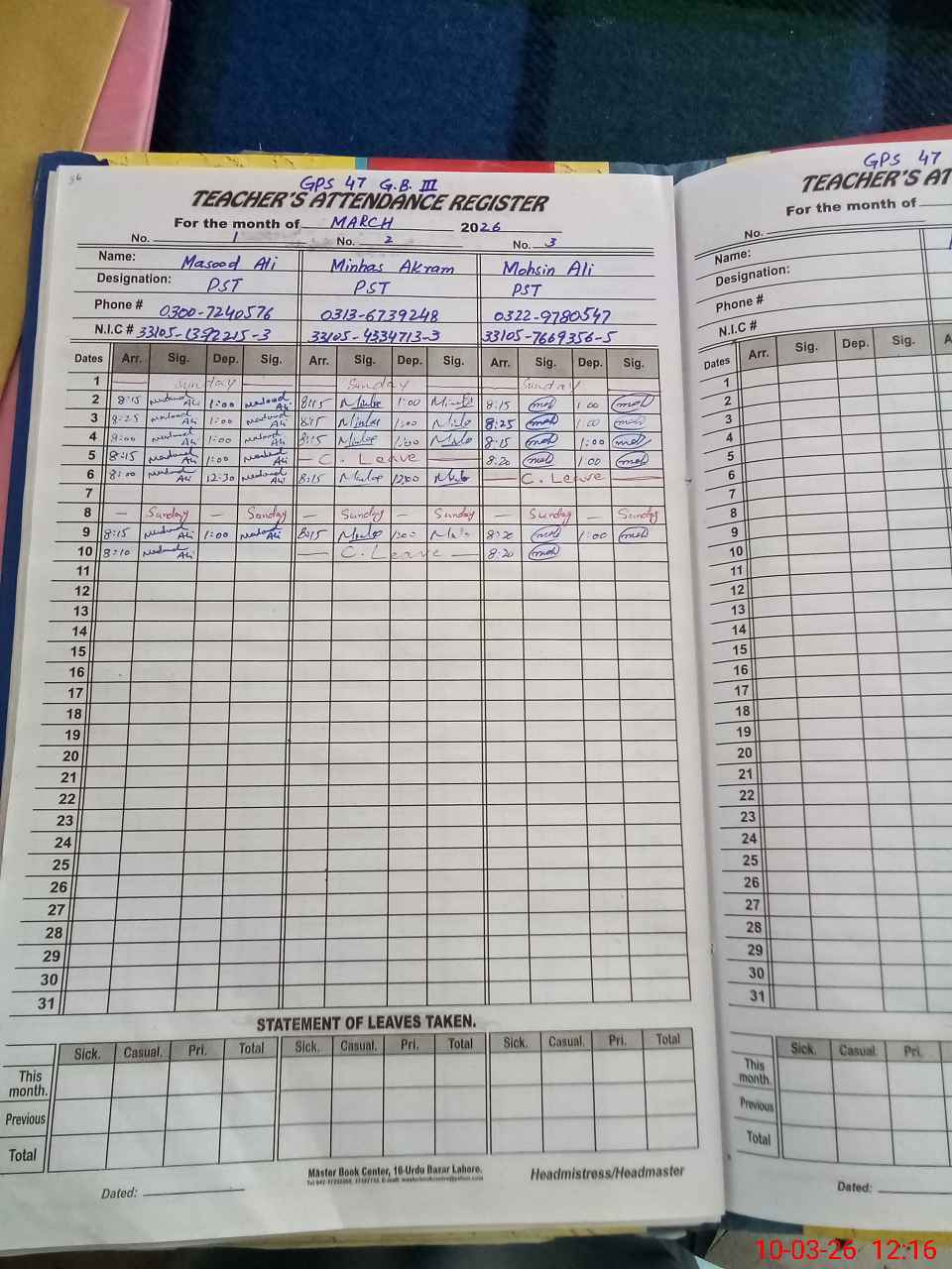 | Name: MA**** AL**** Designation: (School Headmaster's/Headmistress's) PST Phone/Cell Number: 03**** |