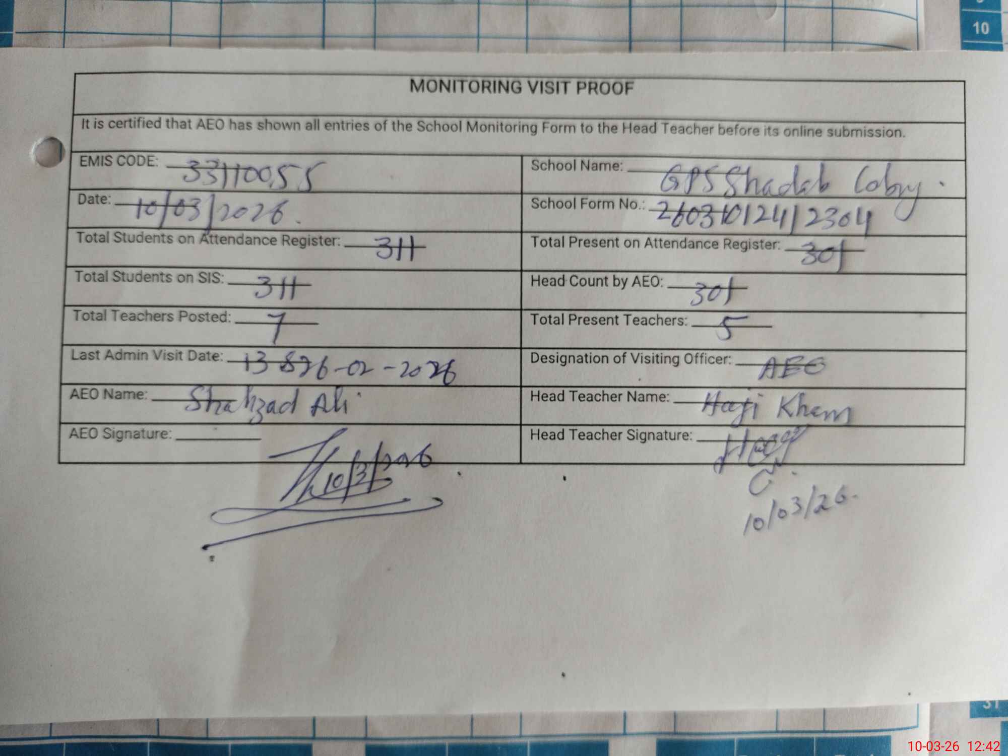 | EMIS Code: 33110055 | Name of School: GPS SHADAB COLONY | |||
