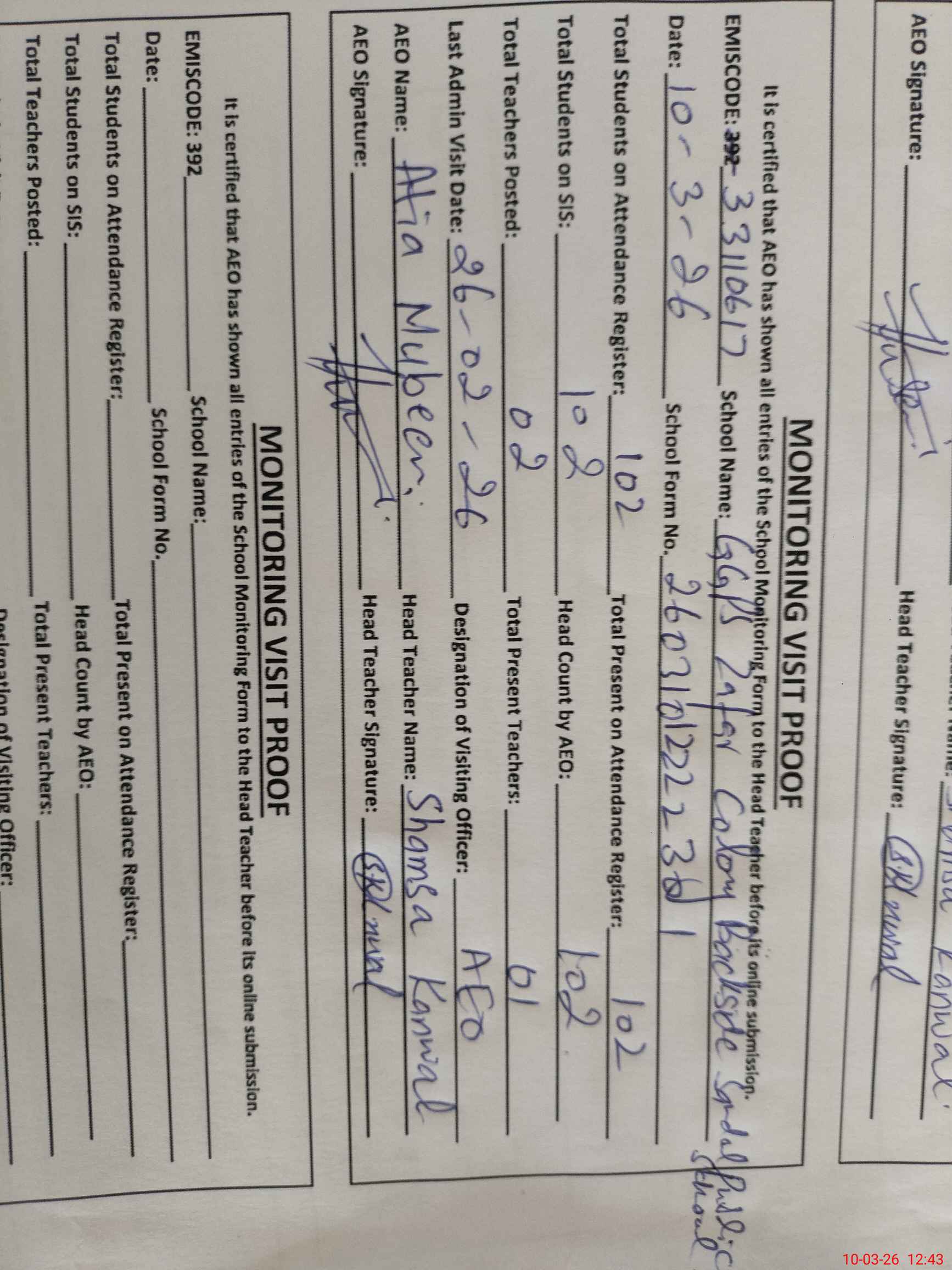 | Certified that this School was Inspected by the Undersigned MEA/DMO Today and the Information Stated Above is as Per Record. | |||||